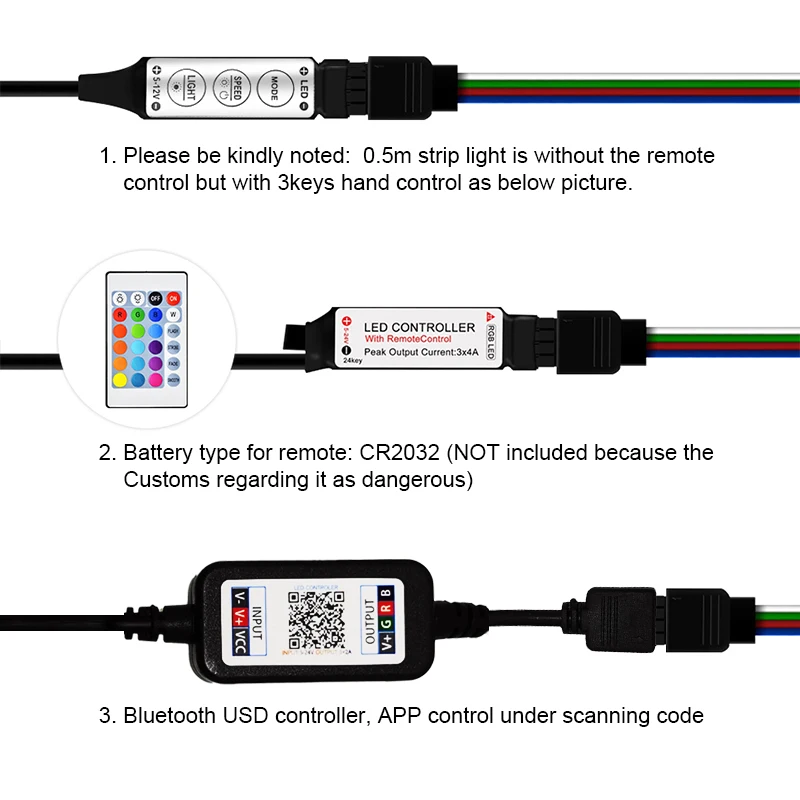 1. Пожалуйста, обратите на это внимание, пожалуйста, примите к сведению, что 0,5 м ленты светильник без дистанционный пульт, но с 3 клавиши ручного управления, как показано на рисунке ниже.