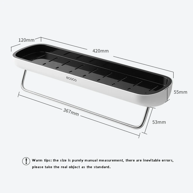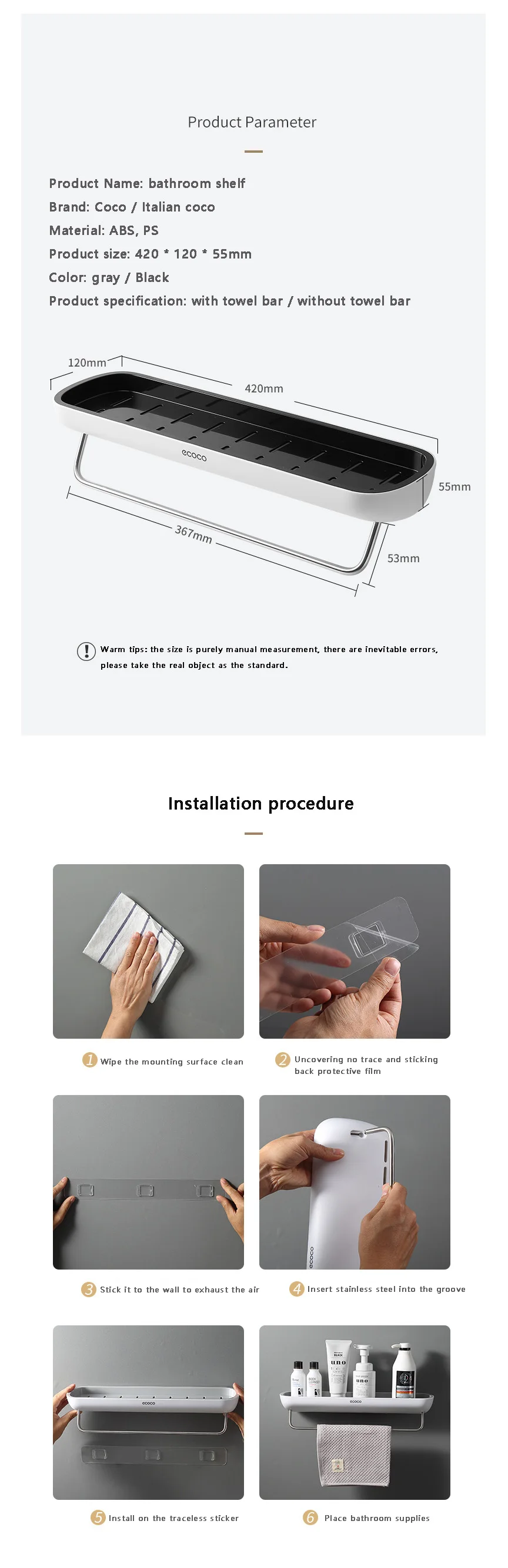 ① Примечание:1. Дренаж и вентиляция, экономия пространства, отсутствие гвоздей и сверл,2. Сильная несущая способность и широкое применение.3. Туалет эксперт, подвижная вешалка для полотенец,② Спецификация:4. Цвет: черный, серый.5. Размеры: 42 см х 12 см х 5,5 см6. Вес: 480 г, 620 г7. Материал: АБС + ПППримечание:Могут быть некоторые ошибки в фактических ручных измерениях. Фактический размер зависит от фактического товара.· Из-за различных условий освещения и съемки цвет изображения может немного отличаться от фактического продукта. Пожалуйста, ознакомьтесь с фактическим товаром.