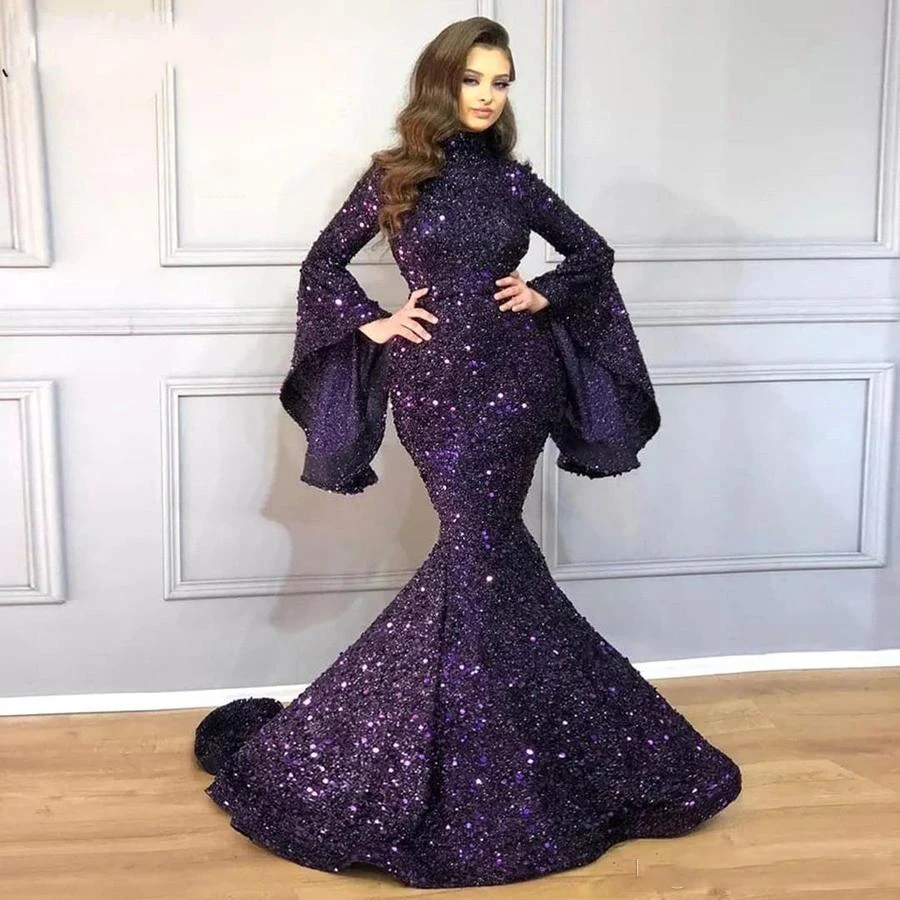 Роскошные Русалка вечерние платье Дубай блестящие туфли на высоком каблуке, украшенные блестками, на шее; Robe De Soiree шик Abendkleider, теплая одежда с длинным рукавом индивидуальный заказ вечернее платье