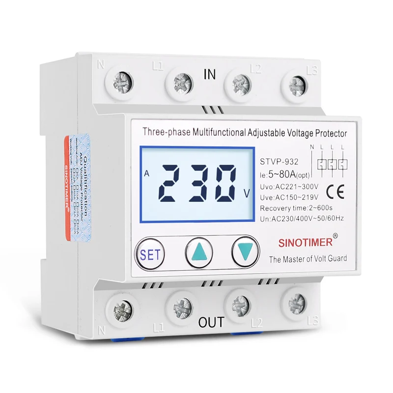 STVP серия SINOTIMER marca АКПП-tensión y на завязках, tensión протектор является adecuado para 3 фазы переменного тока 380V 50/60Hz corriente de trabajo Номинальная 50A o 63A o 80A o menos cargasSu caracterina principal es cuando el circuito tiene sobretensión o bajo voltaje, el producto puede cortar la fuente de alimentación instantamente para proteger el equipo eléctrico de daos, el protector puede encender automaticamente la fuente de alimentación cuando el voltaje del circuito vuelve a lo normal.