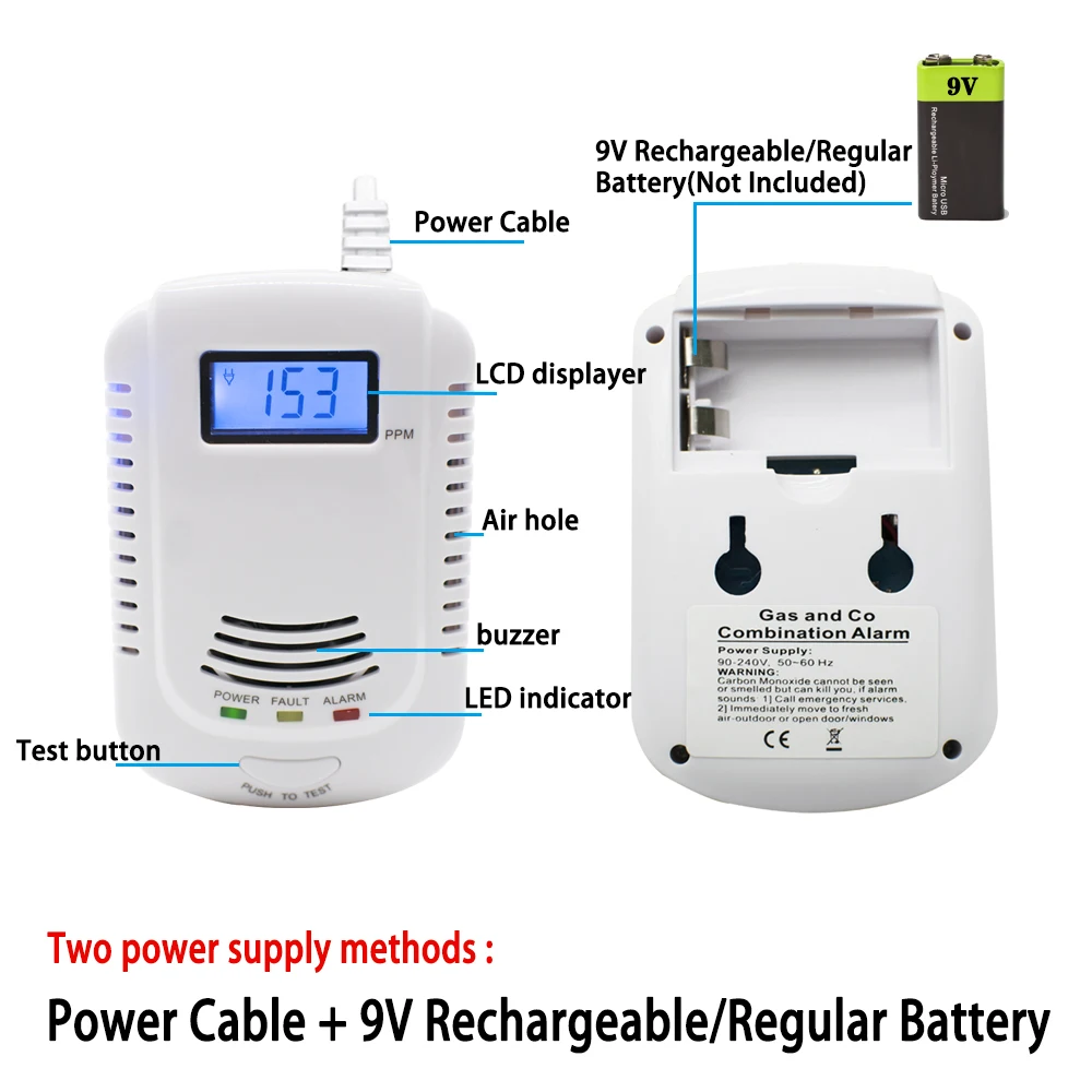 Кнопка Push/test-подключение к аккумулятору питания 90-240 В или 9 В (не входит в комплект), детектор отобразит 3 минуты подсчета.【LCD цифровой дисплей 】На этом дисплее четко показаны уровни газа, которые устройство обнаружило и хранило-от 0 до 3000 ppm-и оно обновляется каждые 9 секунд, чтобы указать любые внезапные изменения.【Голосовое управление 】Когда концентрация окиси углерода достигает 100ppm или концентрация горючих газов достигает 6%, ЖК-экран начинает отображать значение концентрации, И Красный светодиодный индикатор мигает и излучает громкий режим голосовой сигнализации-сигнал 110 децибел.