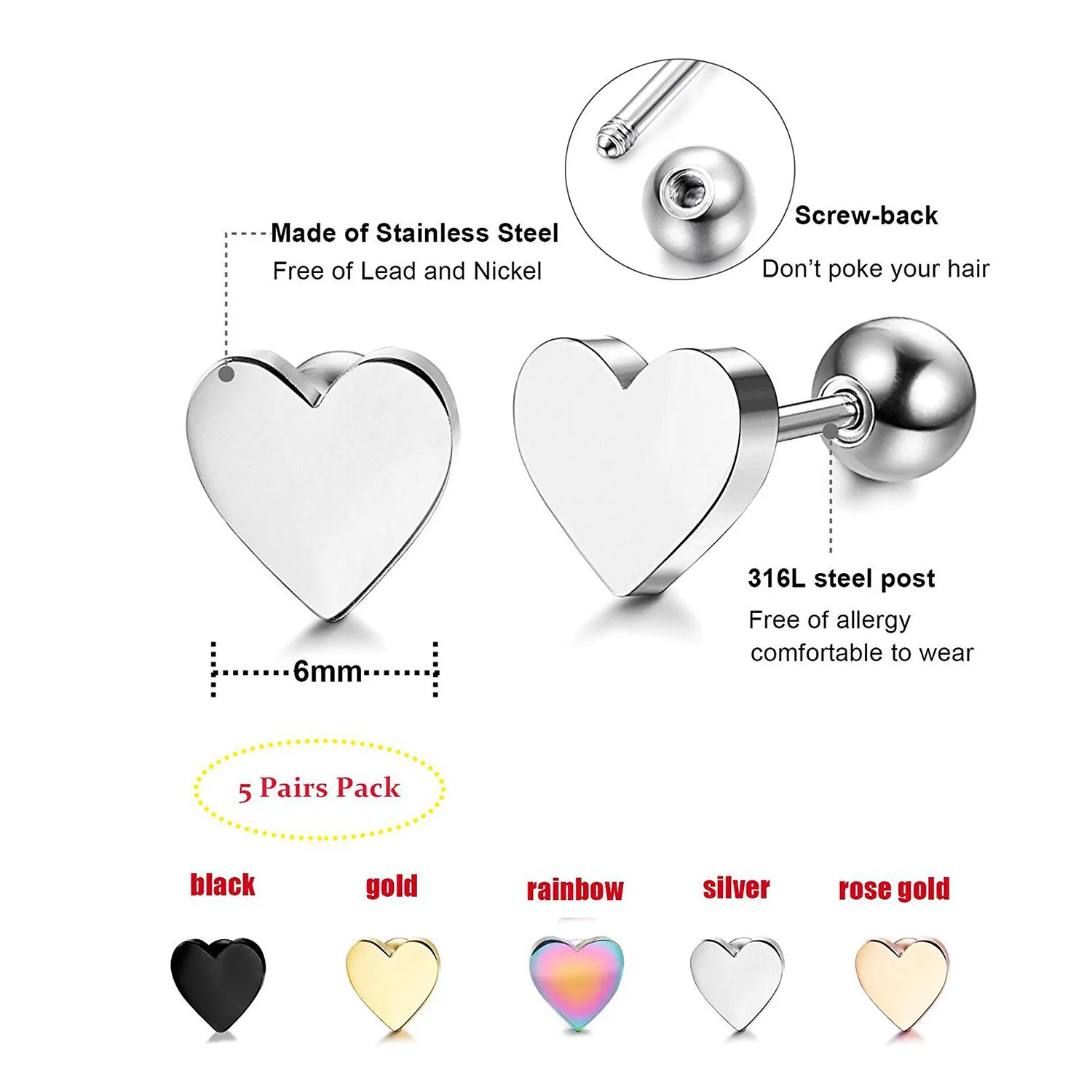 Серьги-гвоздики в форме сердца из нержавеющей стали, простые украшения для ушей, ювелирные аксессуары, 1 шт.