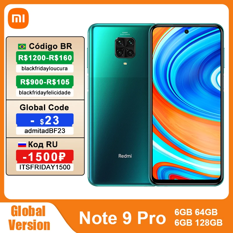 Смартфон Xiaomi Redmi Note 9 Pro, 6 ГБ 64 ГбГлобальная версия ГБ, NFC, Восьмиядерный процессор Snapdragon 128G, экран 720 дюйма, 64-мегапиксельная четырехъядерная камера мАч, 6,67 дюйма, 5020 дюйма