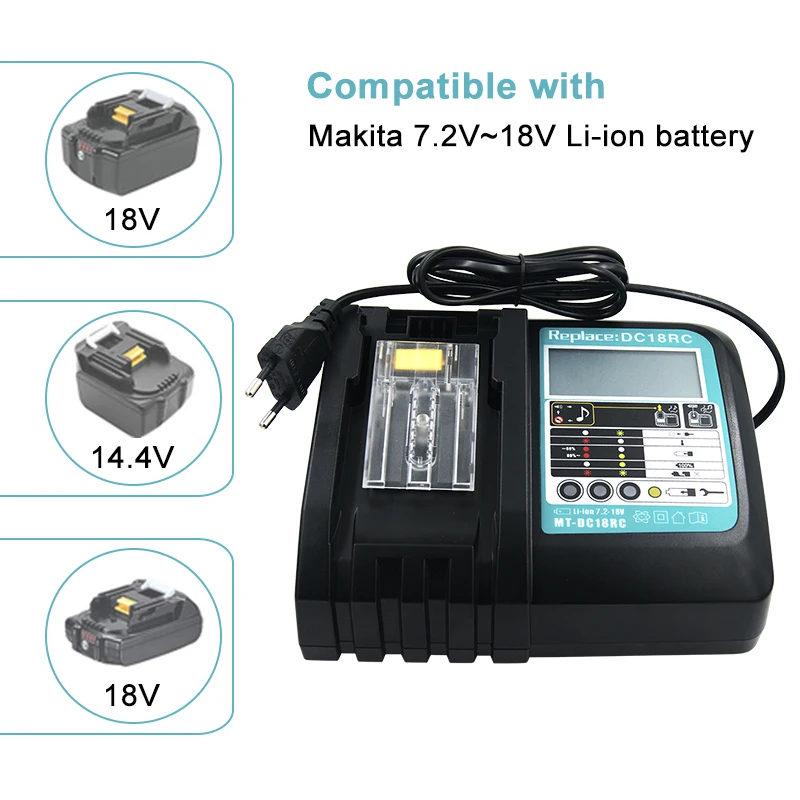 Характеристики зарядного устройства:Товар: Сменное зарядное устройство для батареи Makita 14,4 V 18V (не оригинал)Входное напряжение: AC100 V-240V, 50-60 ГцВыходное напряжение: DC14.4V-18V Макс.Выходной ток: 3AВилка: штепсельная вилка европейского стандартаВес: 650 гХарактеристики: встроенное музыкальное напоминание/охлаждение вентилятора батареи/Интеллектуальная идентификационная система IC.Совместимые коды батарей:18 в BL1815 BL1830 BL1840 BL1845 BL1850 BL186014,4 V BL1415 BL1430 BL1440.BL1445 BL1850 BL1460Примечание: BL1415G BL1430G BL1815G BL1830G и все батареи серии G не поддерживаются
