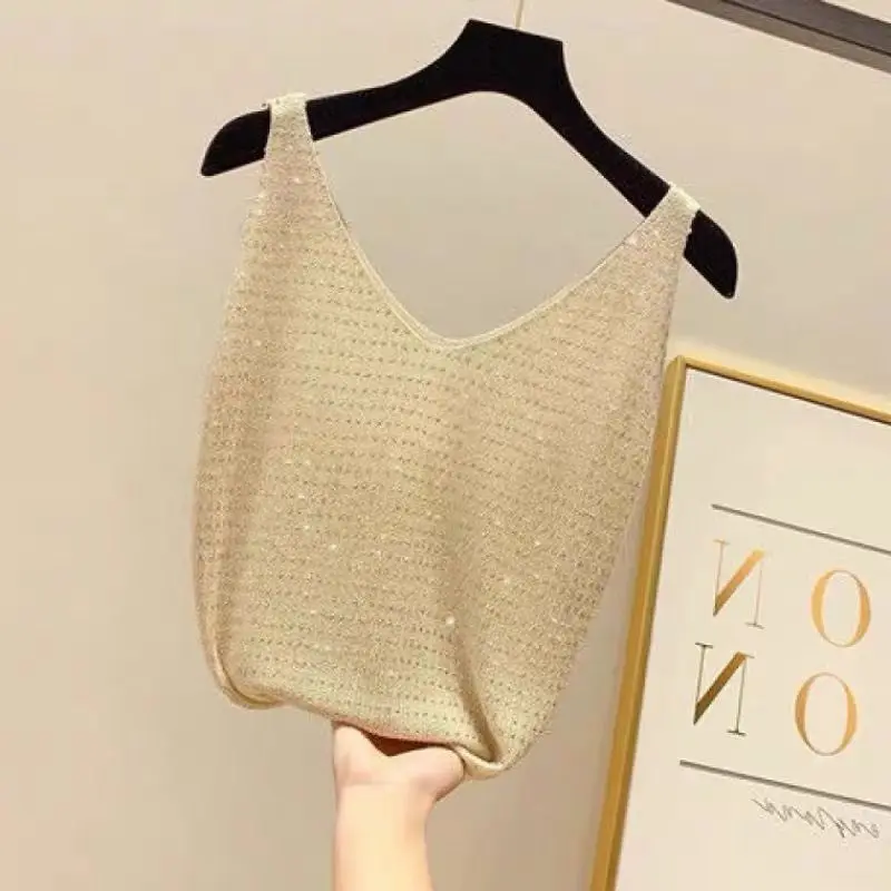 Стразы вязаная нижняя рубашка без рукавов Яркий шелковый жилет топы для женщин 2021