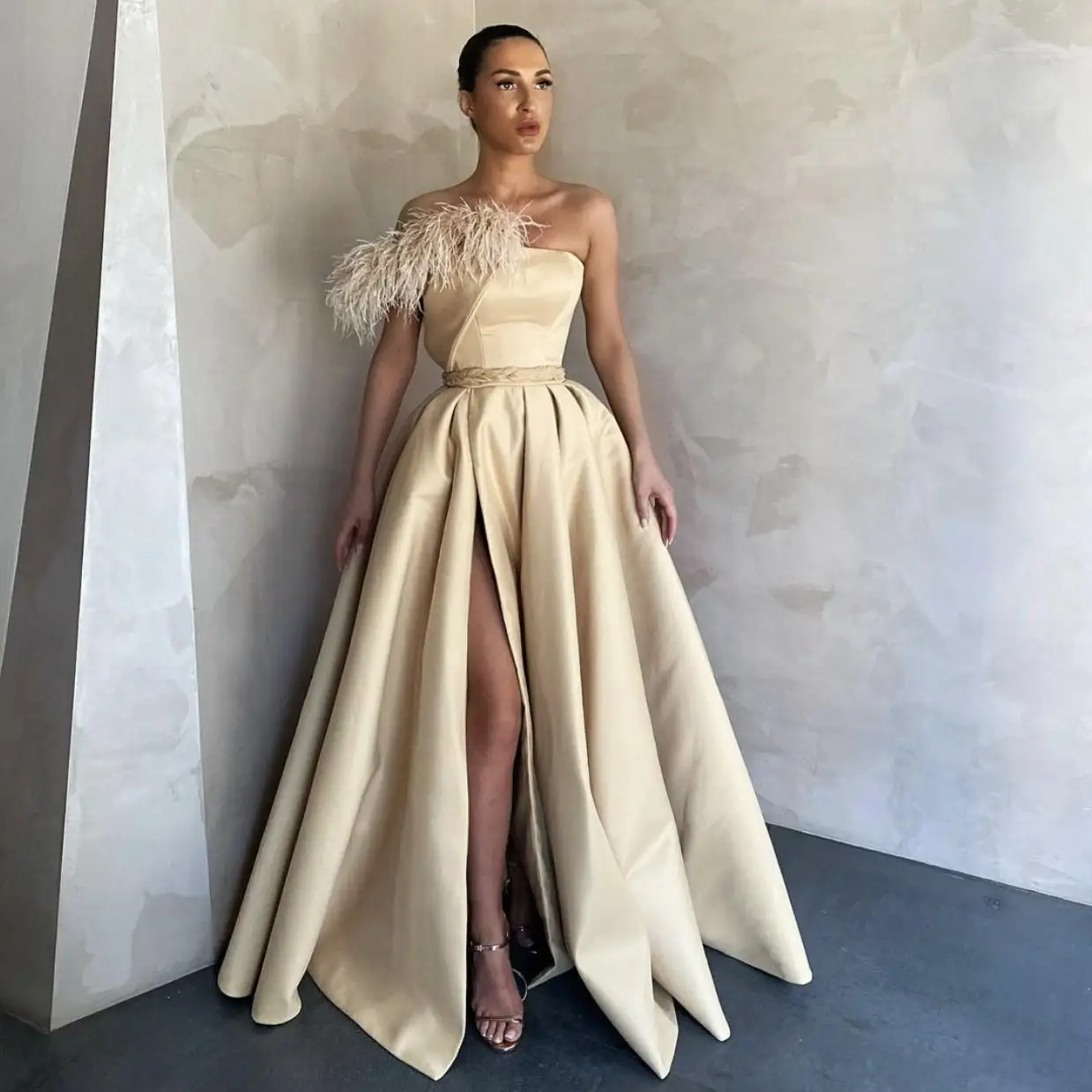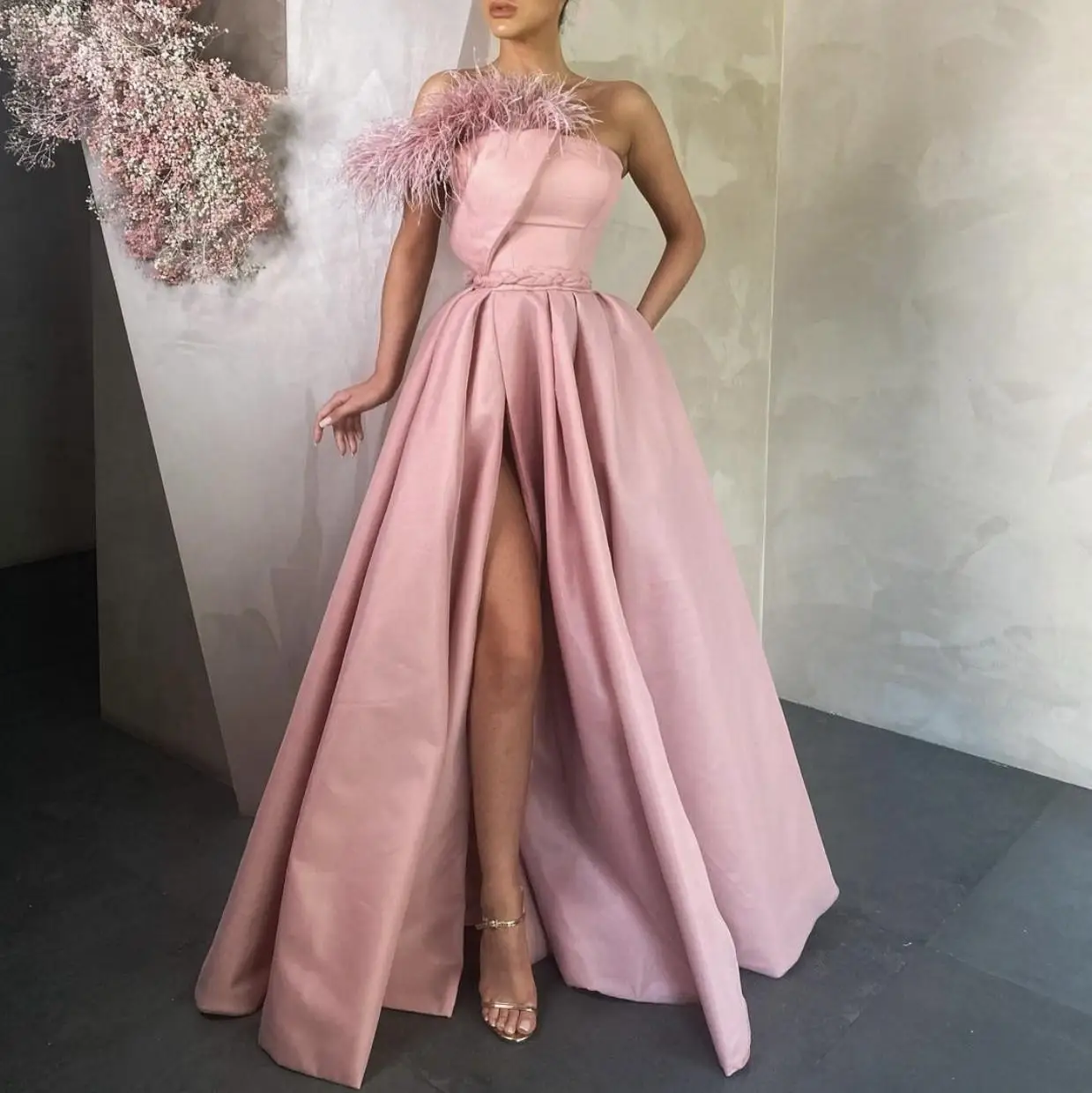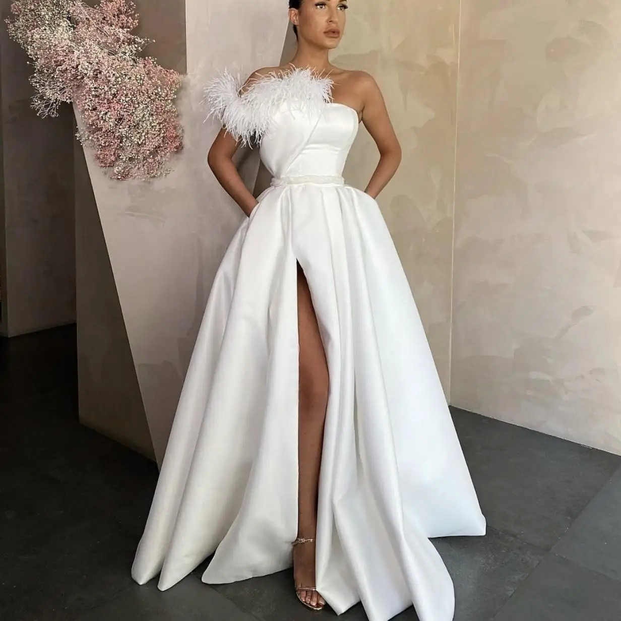 Вечерние платья с открытыми плечами 2021, вечернее платье без рукавов с Боковым Разрезом и карманами, без перьев, атласное ТРАПЕЦИЕВИДНОЕ ПЛАТЬЕ до пола