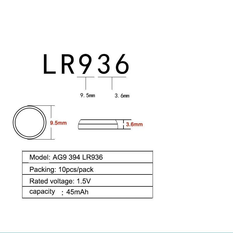 Характеристики: Напряжение: 1,55 в Диаметр: 9,5*3,6 мм Модель: AG9 Также может быть известен как:194, 394, 524, 280-17, 394-1 Вт, 394A, D380, D394, G9, L936, LR936,RW33, S33, SB-A4, SG9, SP394, SR45, SR45H, SR936, SR936SW, V394