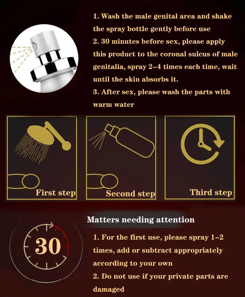 Распылите пенис и головку этим продуктом за 30 минут до полового акта, затем равномерно распределите.