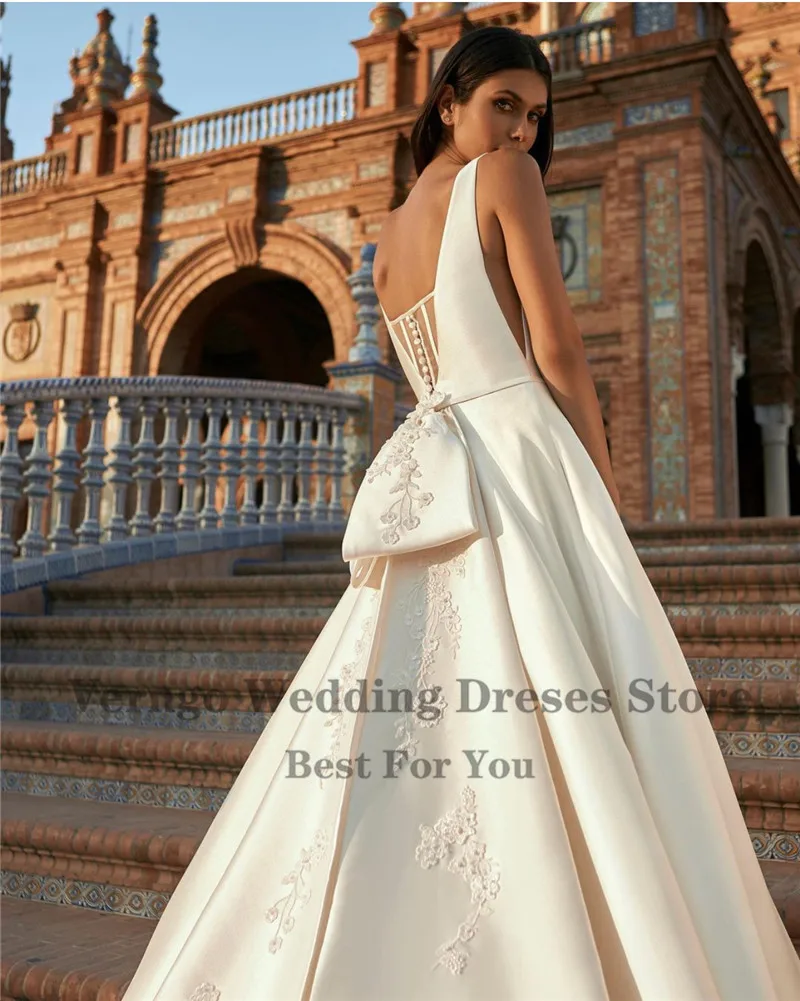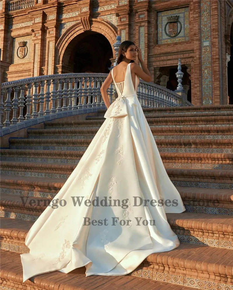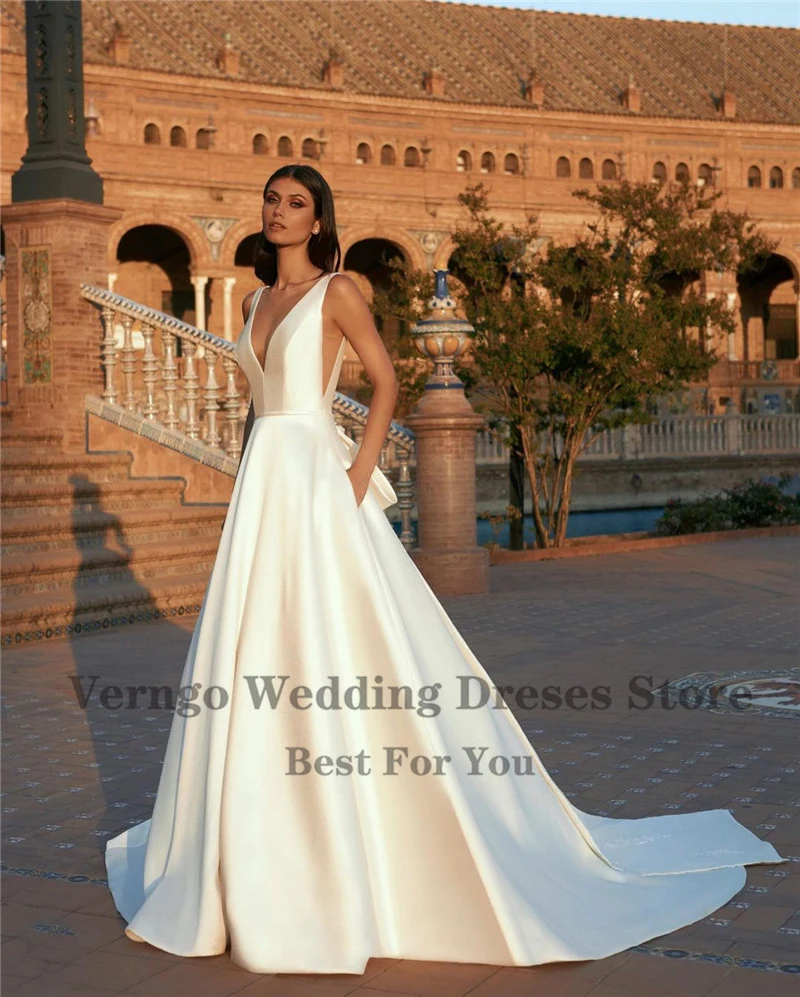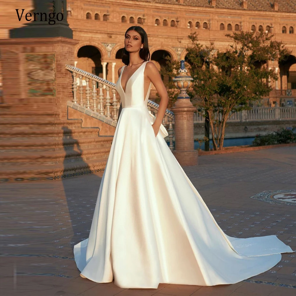 Простое атласное свадебное платье-трапеция Verngo 2021, прозрачное платье с вышивкой на шее, аппликацией и бантом, на пуговицах сзади, с карманами
