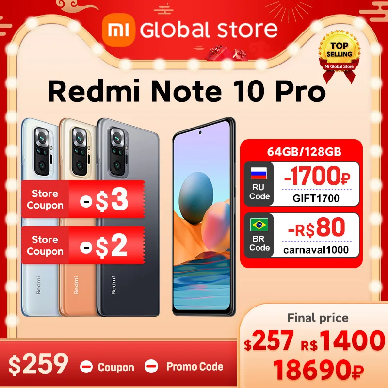 Смартфон Xiaomi Redmi Note 10 Pro, глобальная версия дюйма, 64 ГБ128 ГБ, камера 732 МП, Snapdragon 120G, AMOLED дисплей Гц