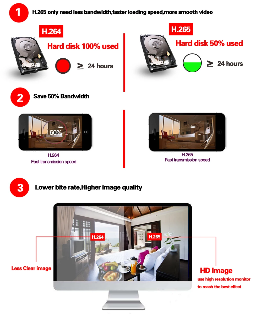 H.265 более четкий, HD разрешение предлагает вам лучшее качество изображения в более низкой скорости. Экономьте больше места для хранения, вы можете уменьшить размер файлов 40%-50%, сэкономить место для хранения HDD и снизить стоимость покупки.