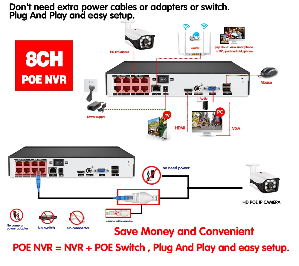 Нет дополнительных кабелей питания или адаптеров, просто подключив ip-камеру к NVR с помощью одного кабеля, вы можете легко завершить установку без знания о компьютере или сети и начать наслаждаться супер простым мониторингом среди вашего смартфона, планшета или ПК.
