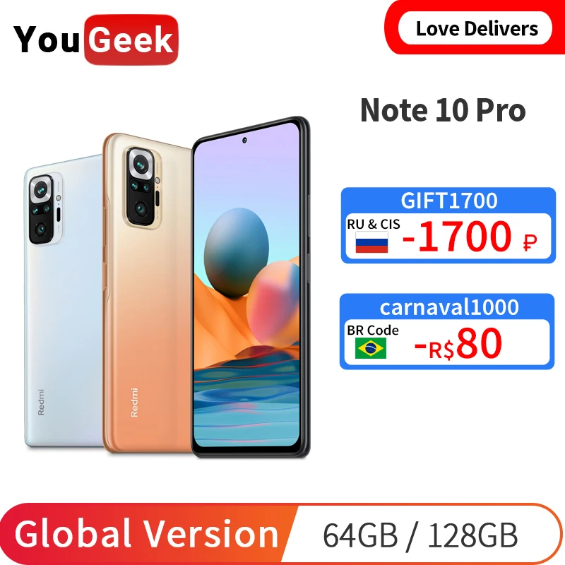 Смартфон Xiaomi Redmi Note 10 Pro, 64 ГБ128 ГБ, Snapdragon 732, AMOLED экран, 33 Вт, быстрая зарядка, 5020 мАч