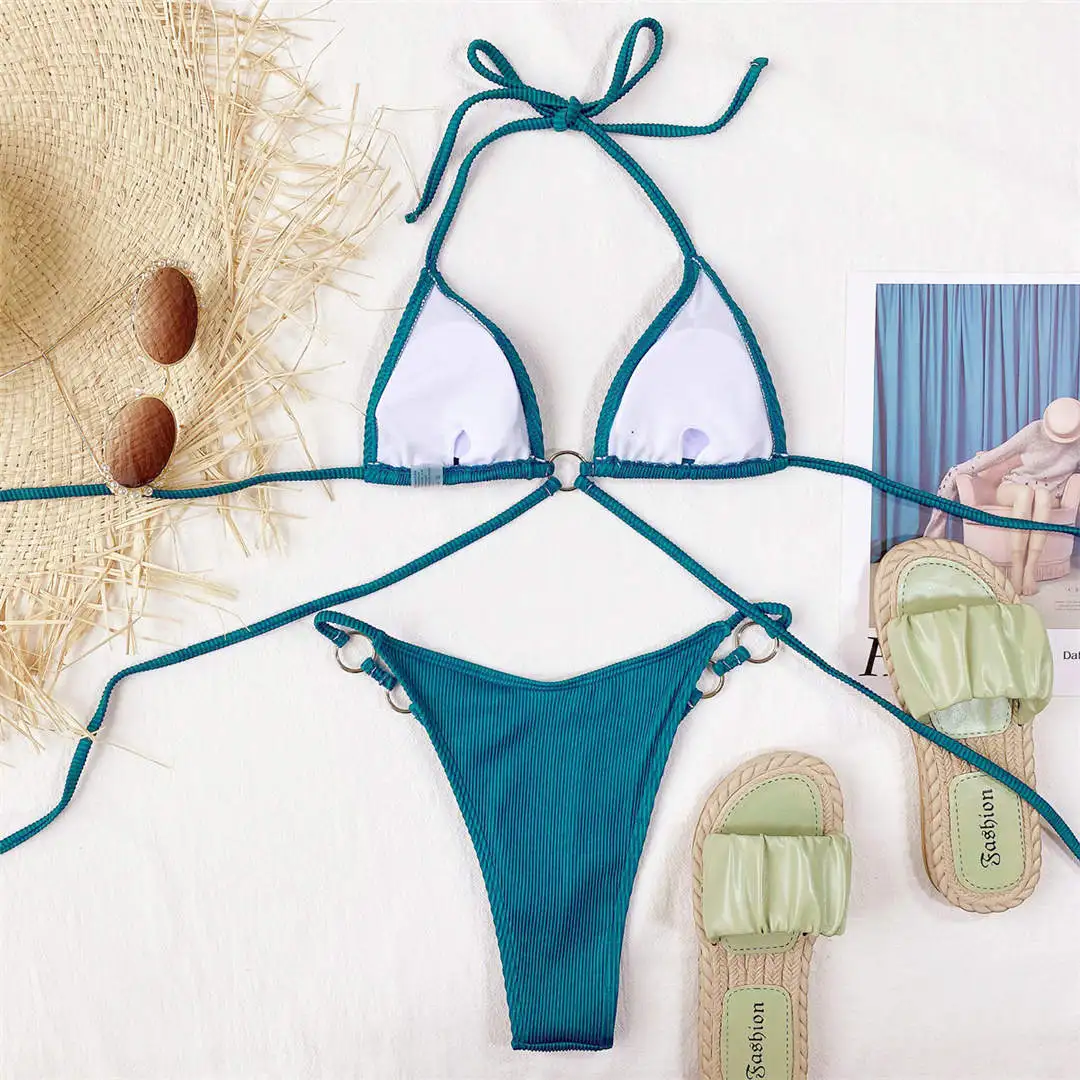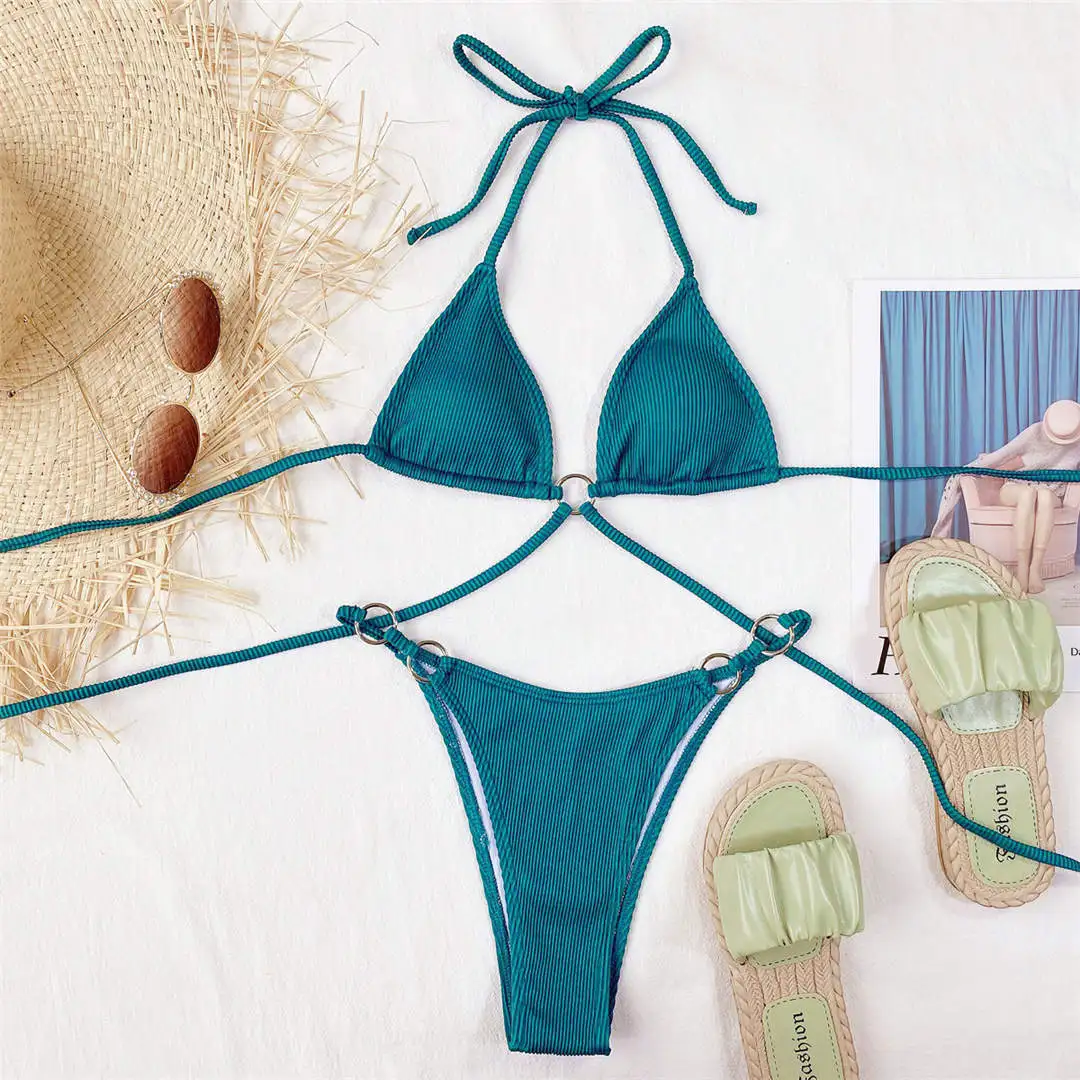 Сексуальное бикини в рубчик с лямкой на шее, женская одежда для плавания, женский купальный костюм, комплект бикини из двух частей, вырез с высокими штанинами, купальный костюм для плавания, V2917, 2021