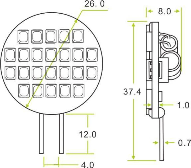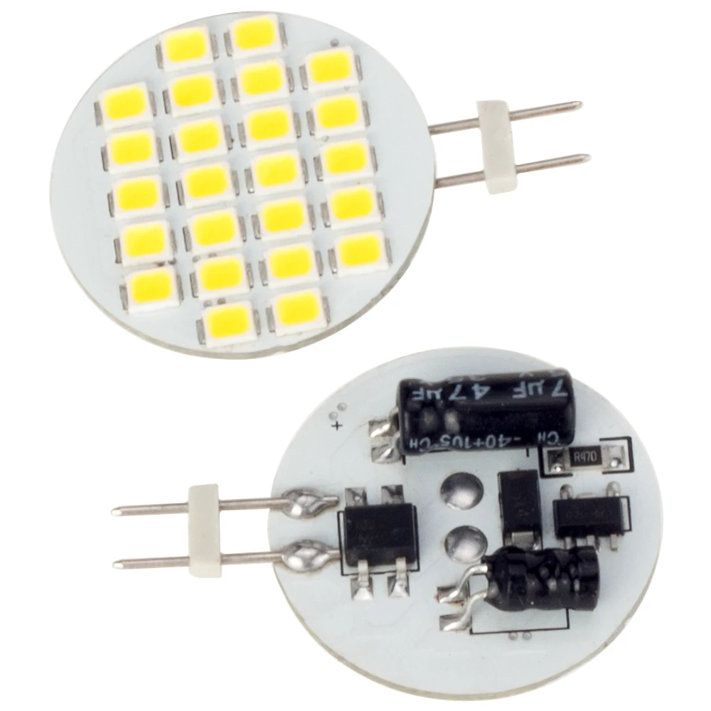 Светодиодный диск G4 имеет 24 светодиодный s с выходом до 360 люменов на 3000K-3500K или 5500-6000K. Светодиоды крепятся на одну сторону диска для прямого освещения на 180 °, не тратя впустую светильник.