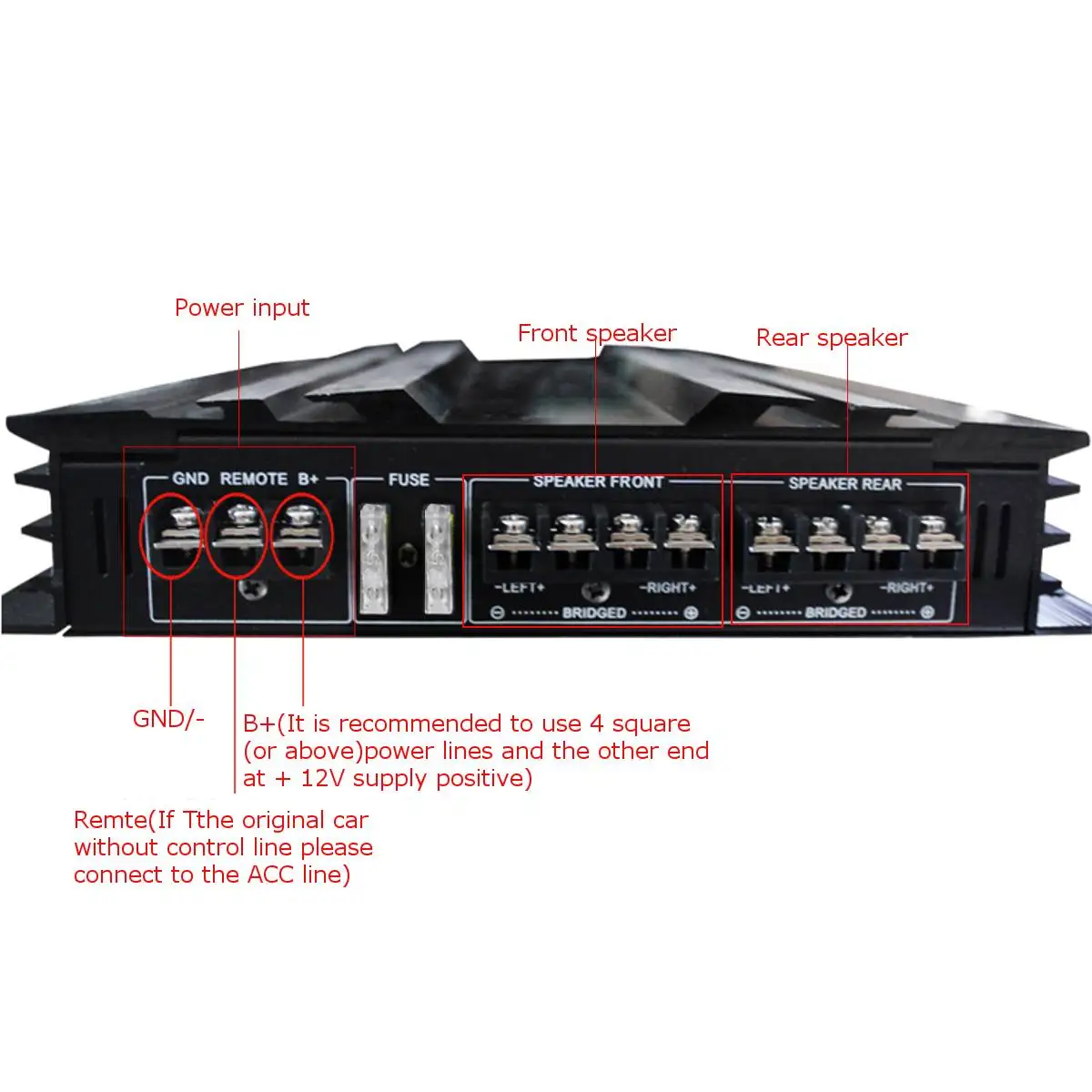 Посылка в комплекте 1X4 канальный автомобильный усилитель Руководство пользователя на английском языке-1 шт. Совершенно новый и надежный 4-канальный автомобильный усилитель 5800 Вт дает вам чудесное развлечение в автомобиле. Можно подключить к 4 динамикам, удовлетворяя потребности большинства пользователей. Технические характеристики 1. Модель: C266 2. Максимальная мощность (2 Ом) 1450 Вт * 4 = 5800 Вт, Максимальная мощность (4 Ом) 725 Вт * 4 = 2900 Вт 3. Мощность RMS (2 Ом) 700 Вт * 4 = 2800 Вт, Мощность RMS (4 Ом) = 300 Вт * 4 = 1200 Вт. 4. THD: <0.02% 5. Чувствительность: 90 дБ 6. Частотная характеристика: 20 Гц ~ 20 кГц 7. Рабочее напряжение: 12 В 8. Размер: 32х24х4, 5 см 9. Материал: алюминиевый сплав