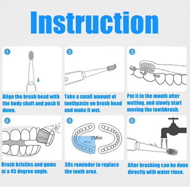 Особенности продукта: Мощная очистка до 41000 ударов в минуту 3 часа зарядки для MINIUM 15 дней использования Мягко и эффективно достигает глубины между зубами и вдоль линии Автоматический таймер на 2 минуты, интервалы на 30 секунд для обеспечения чистоты в четырех квадрантах IPX-7 водонепроницаемый для использования в ванной и душе Длинная батарея Ilife, поддерживаемая зарядкой USB, безопасная и Легкая Автоматическая отключение после полной зарядки, совместима с любым источником питания Зубные щетинки сделаны из нейлона Dupont, подходят для топографии зубов для очистки десен и труднодоступных мест Материал: ABS / TPE / DuPont нейлоновая щетина Режим зарядки: 5 В-USB зарядка Напряжение: 3,7 V Мощность: 0,5 W Особенности: 1. Импортная кисть DuPont для пищевых продуктов, защита от выпадения, защита от рассеяния, процесс округления 2, пять режимов вибрации чистые, чувствительные, массаж, решить различные проблемы полости рта 3, корпус водонепроницаемый дизайн, корпус может выдерживать воду потока стирки и вторжение, база IXP7 водонепроницаемый Посылка включает: 1 x ручка для зубной щетки 4 головки зубной щетки 1 зарядное устройство USB