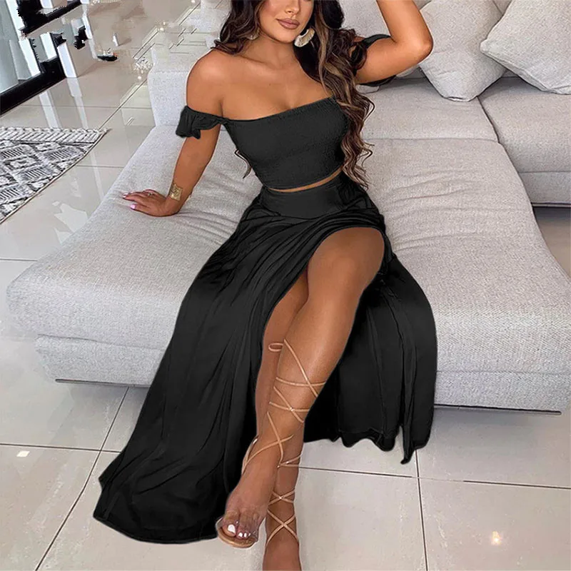 2022 темпераментный Лидер продаж для женщин, топ с открытыми плечами и оборками и юбка до бедра с разрезом, комплекты сплошная шикарная, праздвечерние чные костюмы