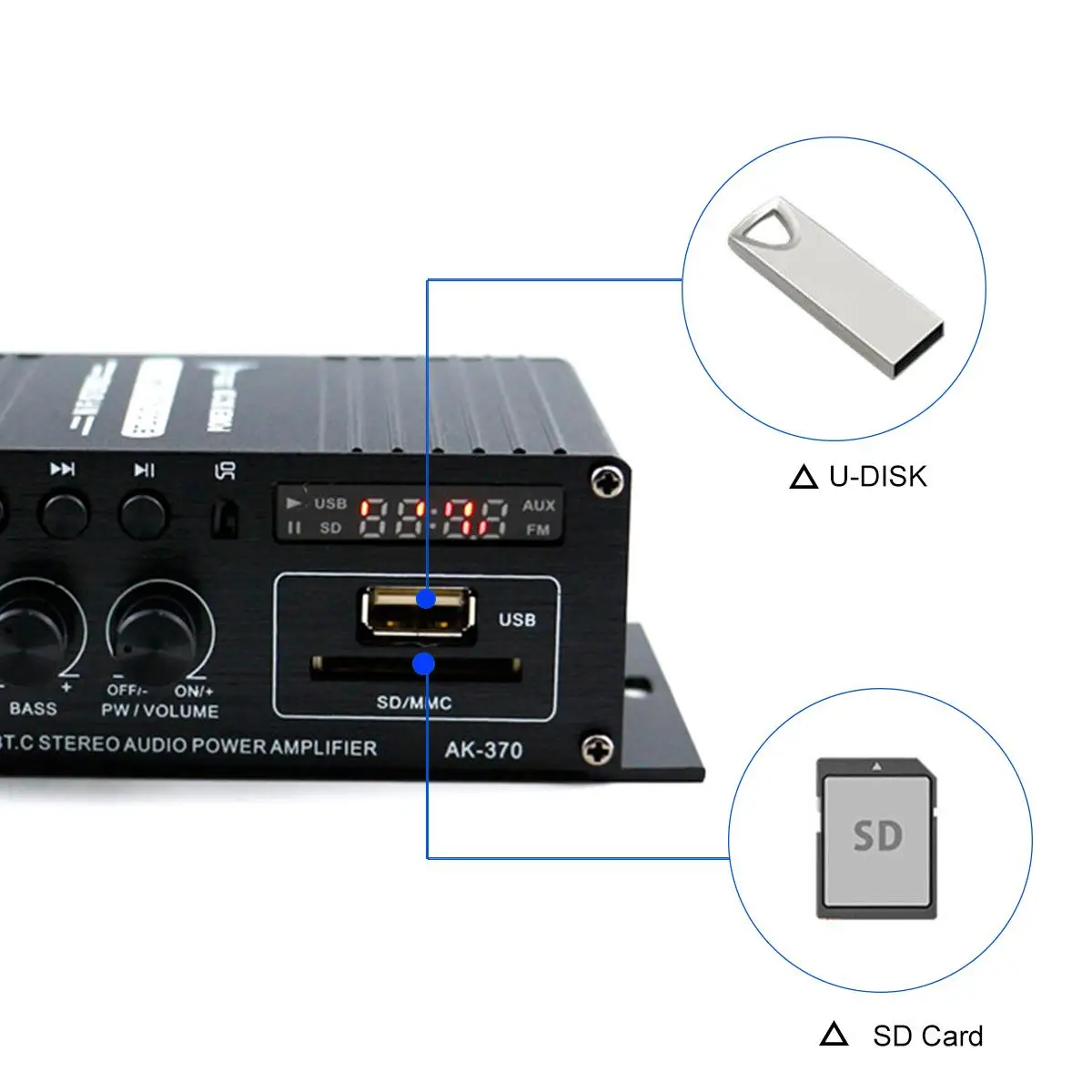 Особенности:-Миниатюрный цифровой усилитель мощности звука bluetooth HIFI.-Корпус из алюминиевого сплава, прочный, корпус один раз изготовлен из алюминиевого сплава, обработка поверхности анодом, общая атмосфера, толстый, ощущение также очень приятно.-Для SD-карты, U-диска, входа AUX, воспроизведения форматов MP3, поддержка беспроводного соединения bluetooth.-Поддерживает FM стерео радио.-Низкие искажения обеспечивают более четкий, мощный и мощный звук.-С функцией дистанционного управления.-Два основных выхода канала.-Машина поддерживает работу по bluetooth, поддерживает линейный вход.