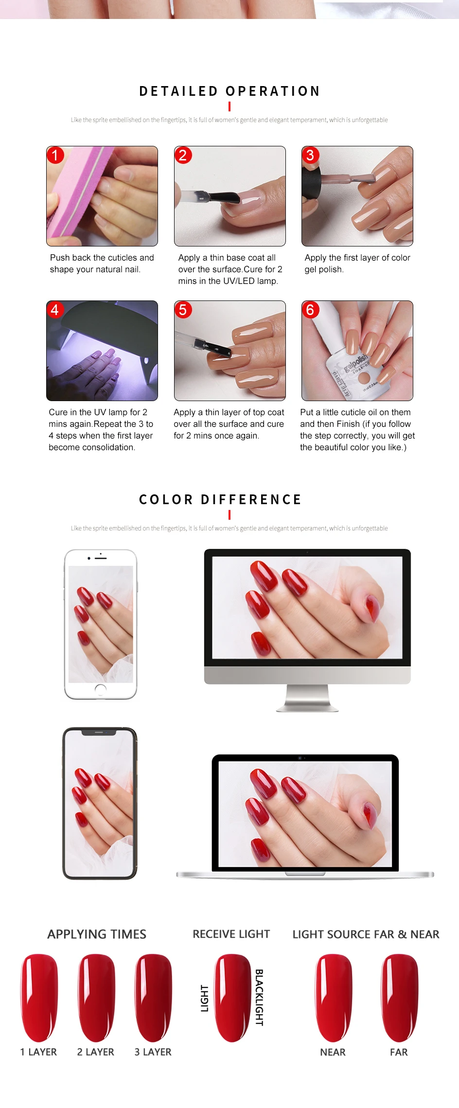 Как использовать:Шаг 1. Полностью встряхните лак, он может сделать цвет полировки сбалансированным. (ВАЖНО)Шаг 2. Сначала нанесите базовый гель, который может сделать лак длительным, высушить УФ-лампой или светодиодный лампой. (Необходимо)Шаг 3. Нанесите лак напрямую, вылечите УФ-лампой в течение 2-3 минут или вылечите светодиодный светильник в течение 60 секунд; При высыхании нанесите второй слой и снова закрепите УФ-лампой или светодиодный светильник.Шаг 4. Пальто со съемным верхним покрытием, которое может сделать цвет более блестящим, излечивается УФ-лампой или светодиодный лампой.