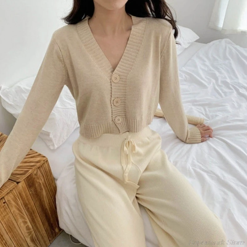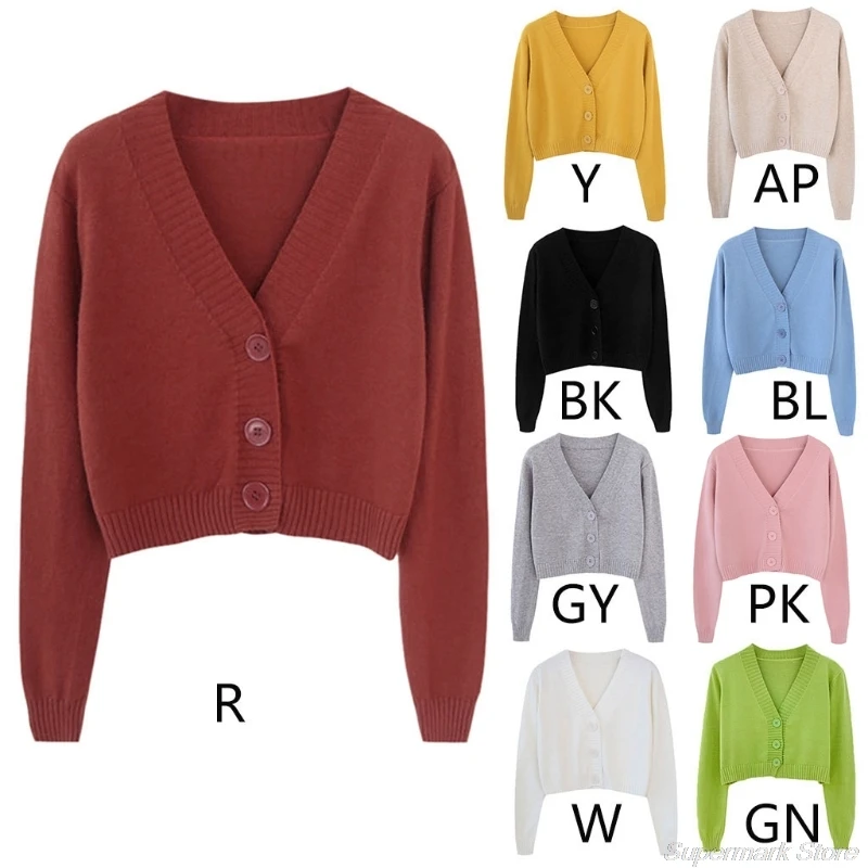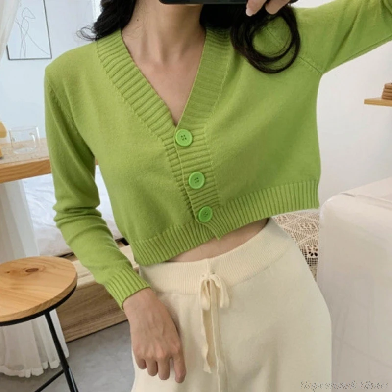 Женский свитер с длинным рукавом, кардиган, сексуальная укороченная куртка на пуговицах с V-образным вырезом, милая однотонная свободная вязаная куртка карамельных цветов M10 21