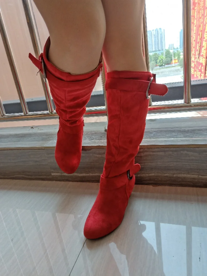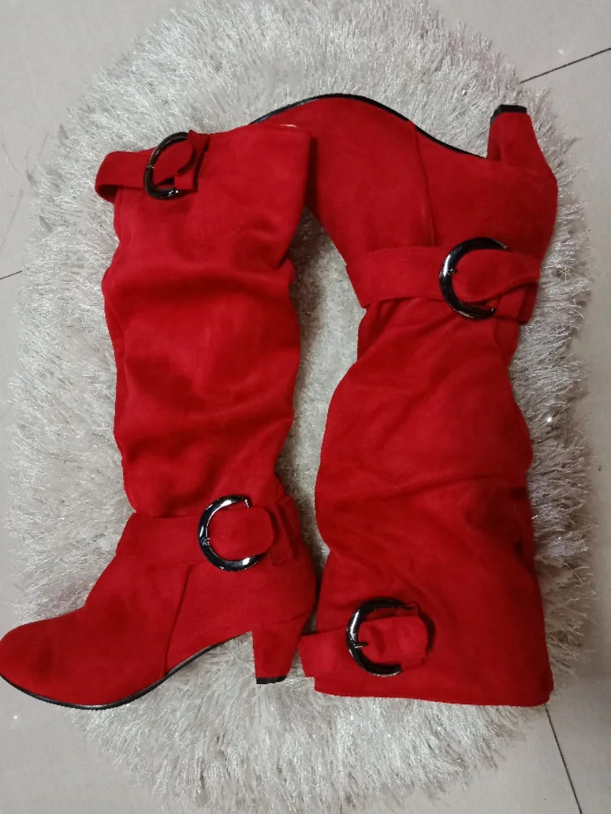 Женские сапоги до колена, из искусственной замши, с пряжкой, на каб...
