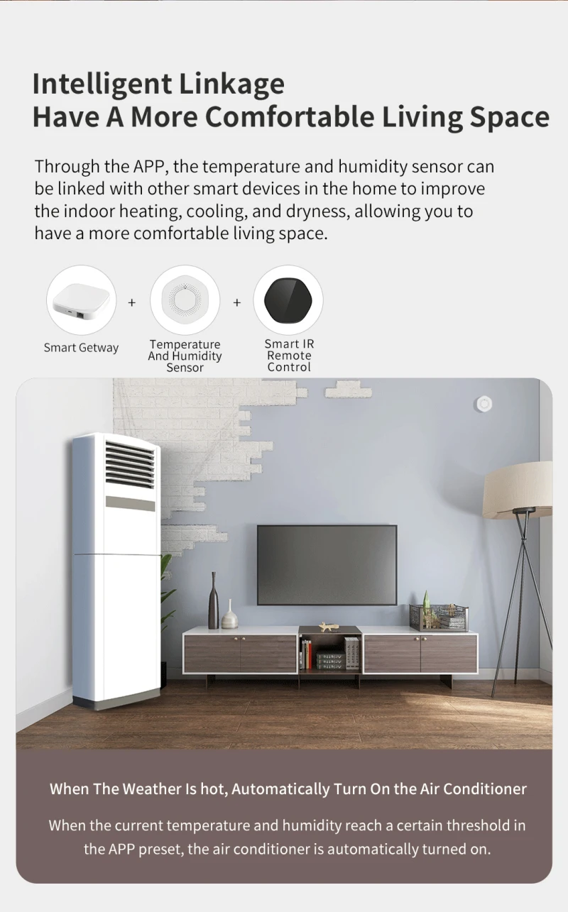 Через приложение датчик температуры и влажности может быть соединен с другими смарт-устройствами в доме для улучшения температуры в помещении, тепла, сухого и влажного, что позволяет вам иметь более комфортное жизненное пространство