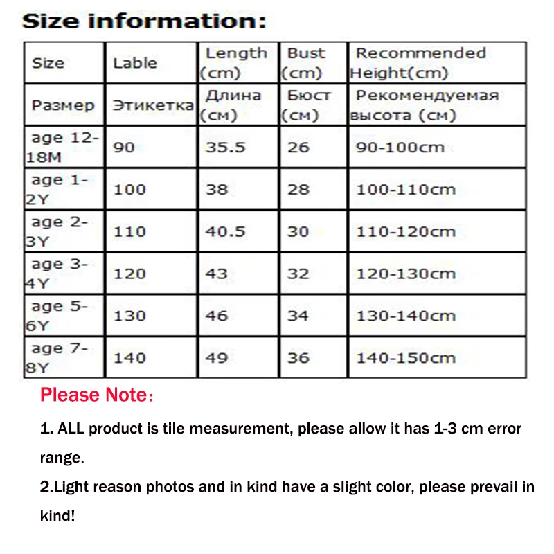 РазмерыЛаблеДлина (см)Бюст (см)Рекомендуемая высота (см)РазмерЭлектронная сигаретаДлина (см)Бюст (см)Детская одежда (см)Возраст 12-18 м9035,52690-100 смВозраст От 1 до 2 лет1003828100-110 смВозраст От 2 до 3 лет11040,530110-120 смВозраст От 3 до 4 лет1204332120-130 смВозраст От 5 до 6 лет1304634130-140 смВозраст От 7 до 8 лет1404936140-150 см Обратите внимание: 1. Все продукты являются измерениями плитки, пожалуйста, учитывайте погрешность в 1-3 см. 2. Пожалуйста, при покупке выбирайте размер в соответствии с таблицей размеров. Если вы не понимаете их, пожалуйста, свяжитесь с нами. Сообщите нам вес и рост ваших детей. Мы поможем вам сделать лучший выбор. 3. Светильник причина фотографии и в натуральной форме, у вас есть s светильник цвет, просим отнестись к этому с пониманием!