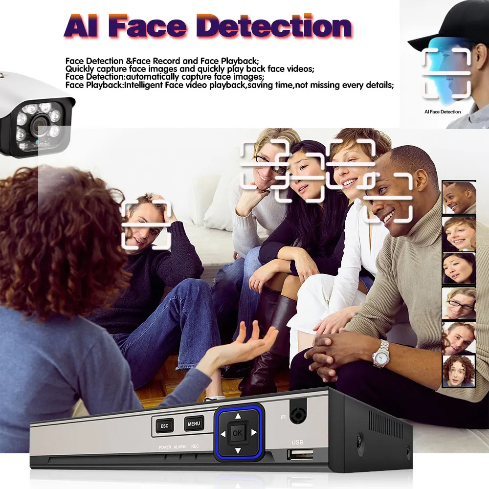④ NVR поддерживает запись лиц, распознавание лиц, умное воспроизведение лиц, обнаружение движения и оповещения по электронной почте, Поддержка Android,Iphone,Ipad,PC,VMS,P2P view;