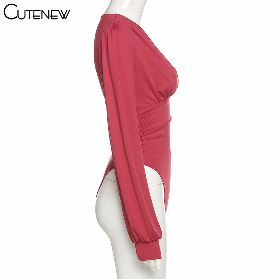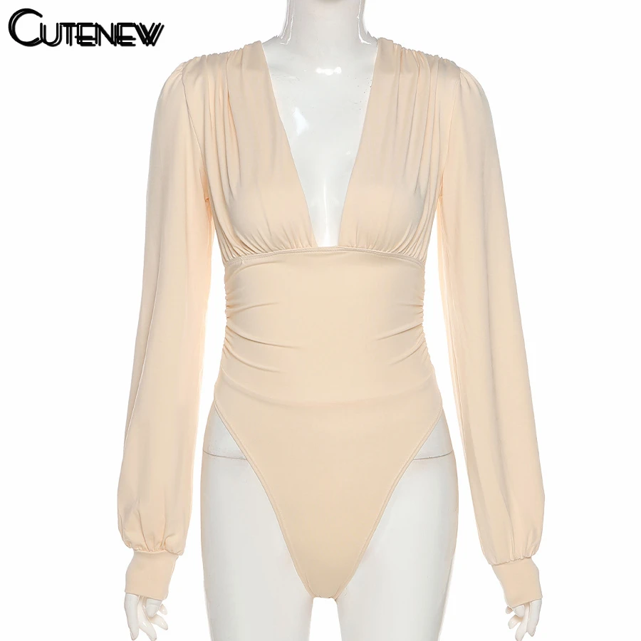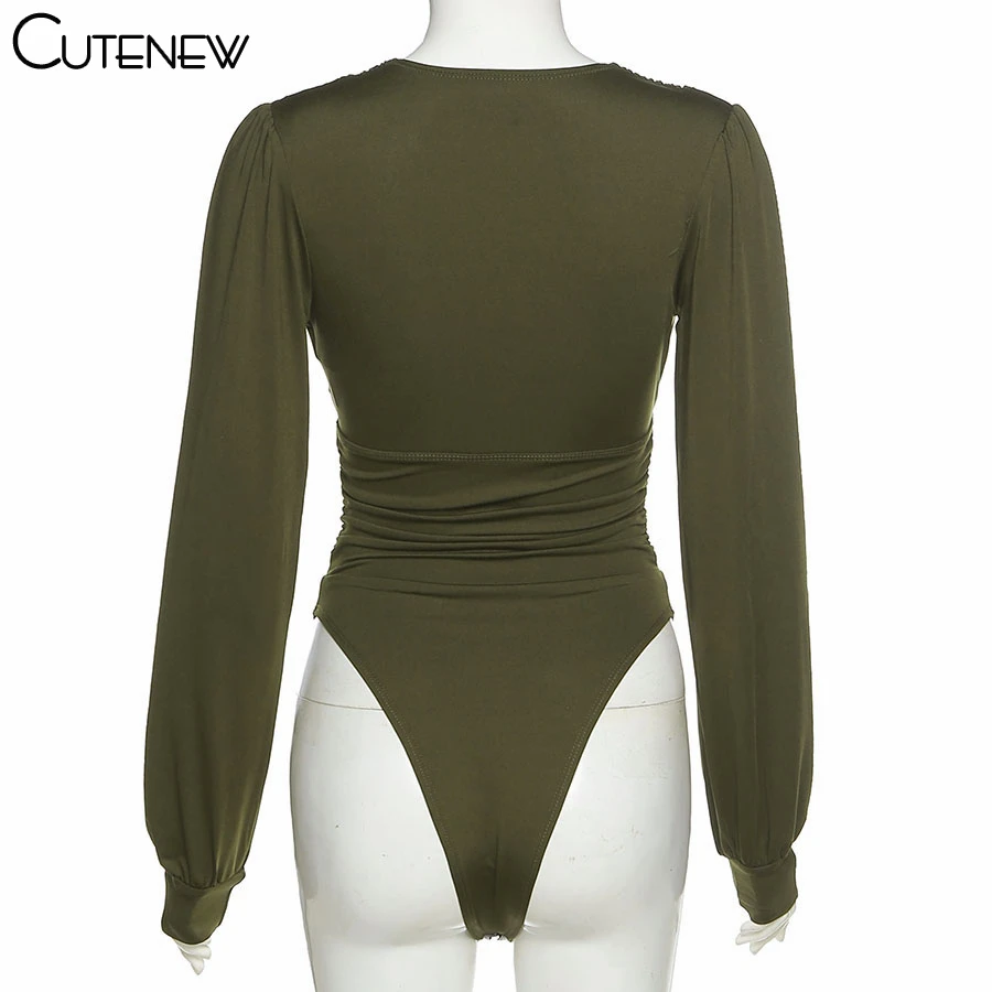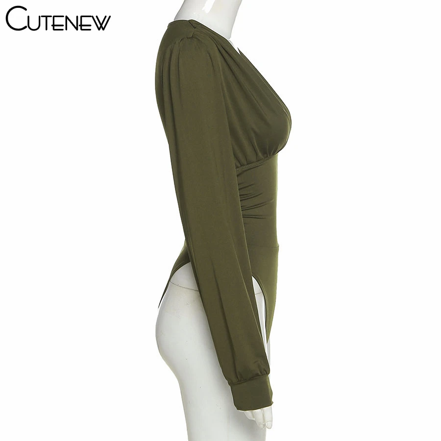 Cutenew однотонные образный Талия Сексуальная Bodycon боди для женщин весна сексуальное нижнее белье с глубоким v-образным вырезом и рукавами-фонариками стройные активные уличная женская одежда