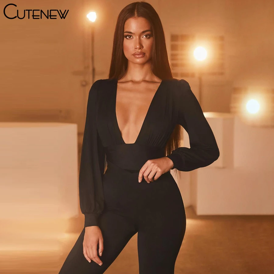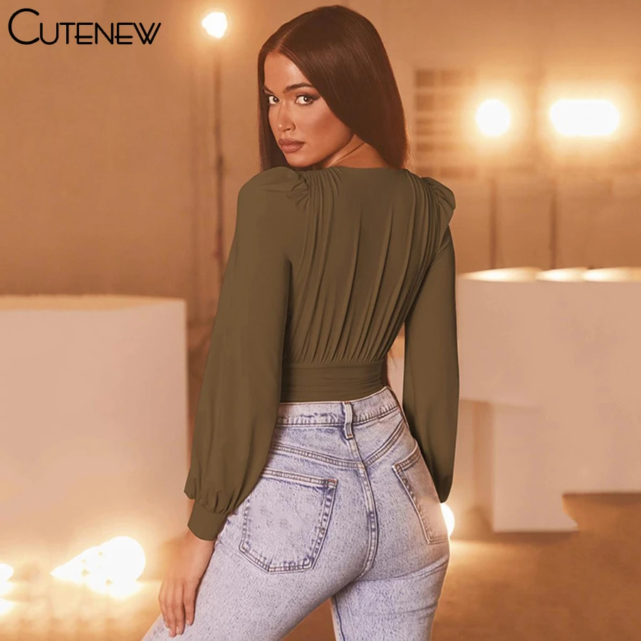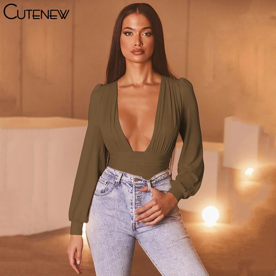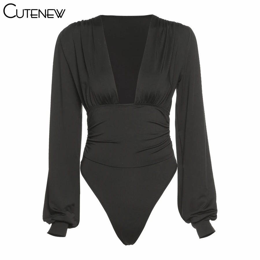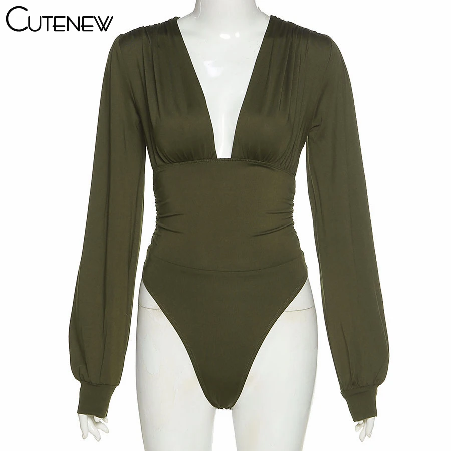Cutenew однотонные образный Талия Сексуальная Bodycon боди для женщин весна сексуальное нижнее белье с глубоким v-образным вырезом и рукавами-фонариками стройные активные уличная женская одежда