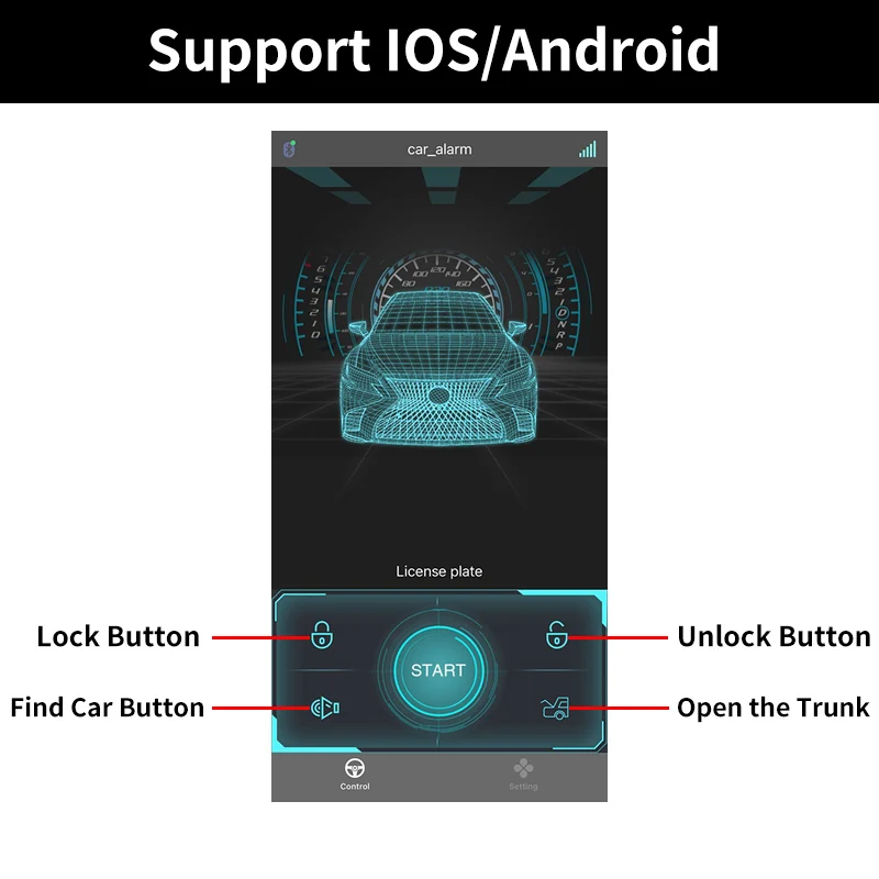 Основные функции:1. Замок2. Разблокировка3. Выпуск багажника4. Поиск автомобиля5. Закрыть окноИнструкция по безключевому входу1. Загрузите приложение после установки будильника2. В настройках приложения есть кнопка обучения коду3. После нажатия кнопки обучения,4. Нажмите кнопку разблокировки и блокировки на пульте дистанционного управления одновременно5. Теперь вы можете управлять автомобилем на мобильный телефон.