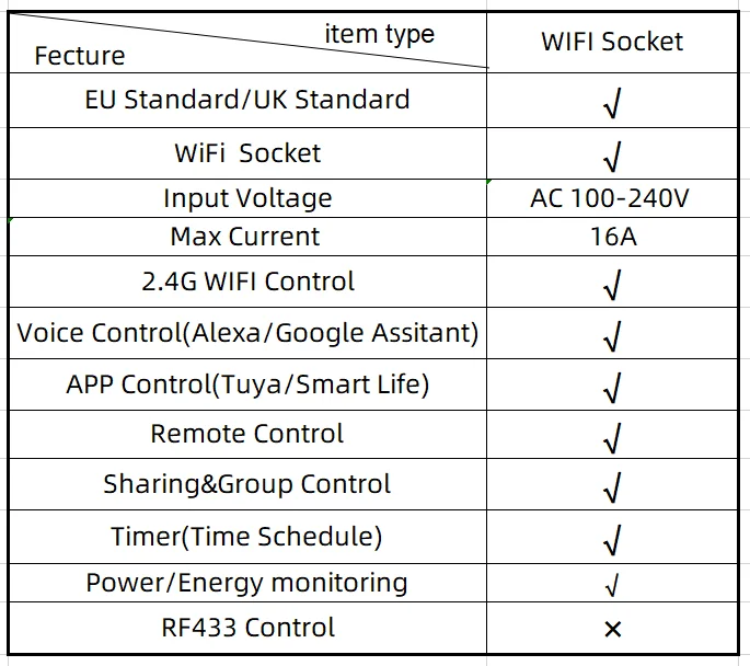 -Название продукта: Стандартная умная розетка Wi-Fi ЕС/Великобритании-Максимальная мощность: 3000 Вт (Сопротивление нагрузке)-Рабочее напряжение: AC100-240V(50/60 Гц)-Материал: огнестойкий полимер абс-Потребляемая мощность: <0,3 Вт-Рабочий ток: макс. 16 А-С монитором мощности-Размеры: 80 мм * 50 мм * 45 мм-Длина шнура: настенный-Поддержка приложения: Android 4,1/IOS 8,0 или выше-Поддержка приложения: «Tuya» или «Smart Life»-Поддержка: совместимость с Alexa и Google AssistantМониторинг энергииУмная розетка может отслеживать в реальном времени в приложении Tuya/smart lifeТок, мощность, напряжение, общее потребление энергии подключаемого устройства можно отслеживать в приложении Tuya/Smart life.