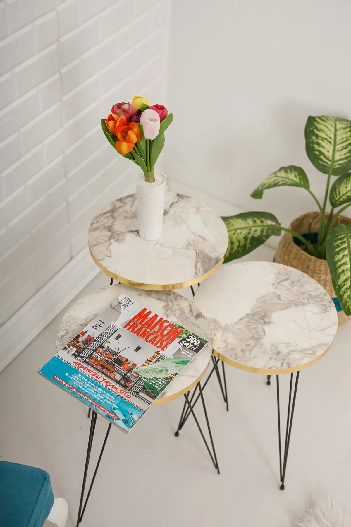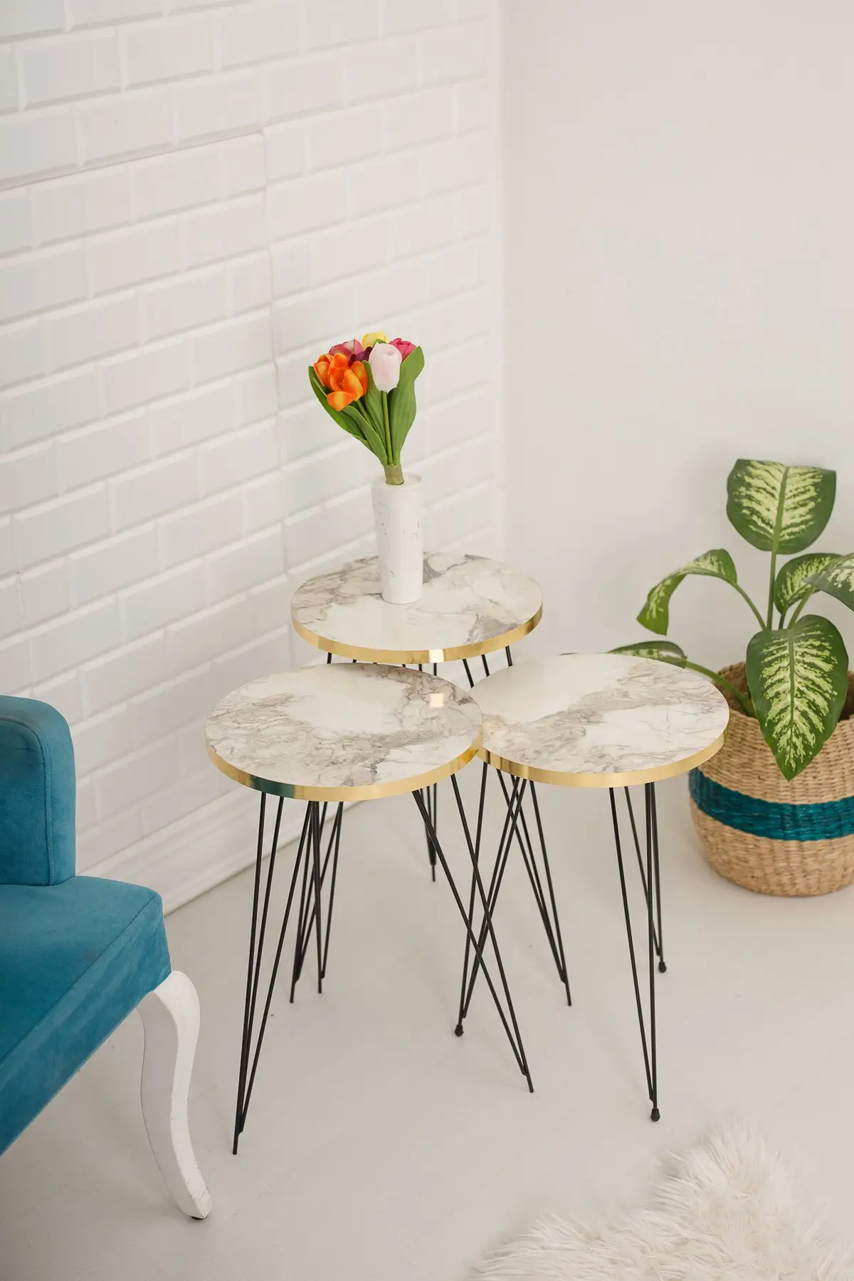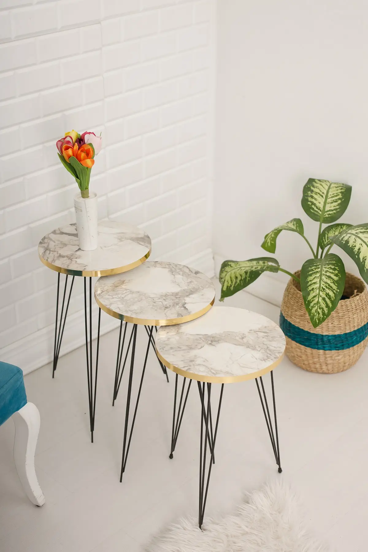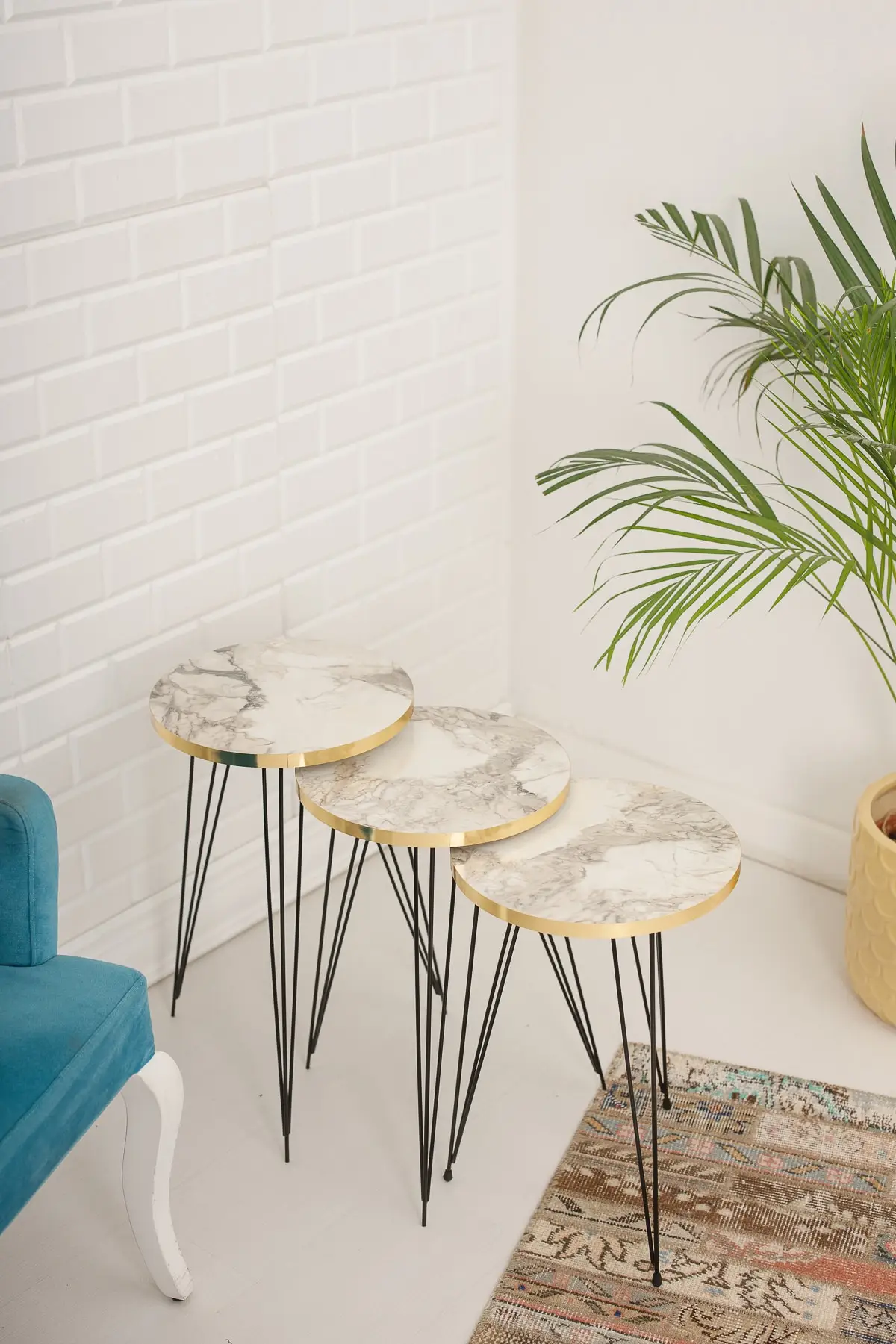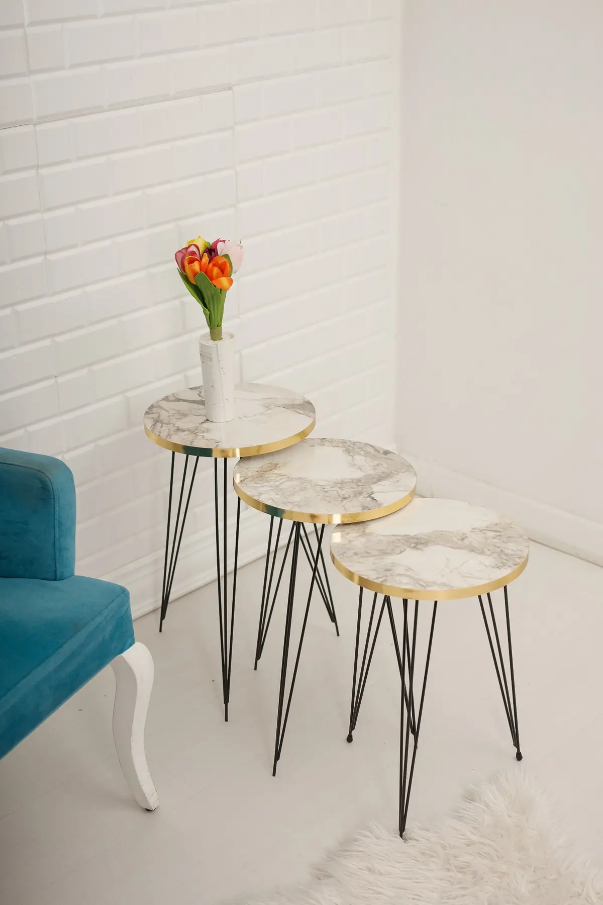 Кофейный столик Zigon, Круглый, в нордическом стиле, с мраморным узором, на металлической ножке, 3 шт.
