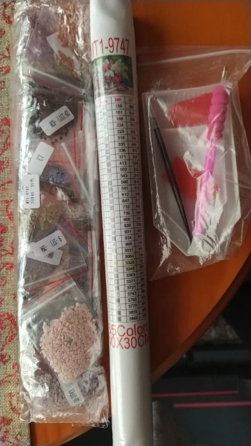 Спасибо большое! Очень яркие алмазы. В наборе 2 лотка под стразы, один побольше, другой поменьше,стилус,клей,пинцет.Есть отдельный лист с номерами цветов, это очень удобно. Все соответствует описанию. Позже добавлю фото готовой картины. Продавца и товар рекомендую.