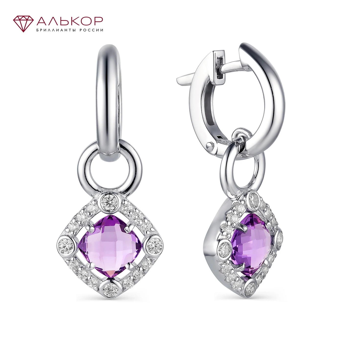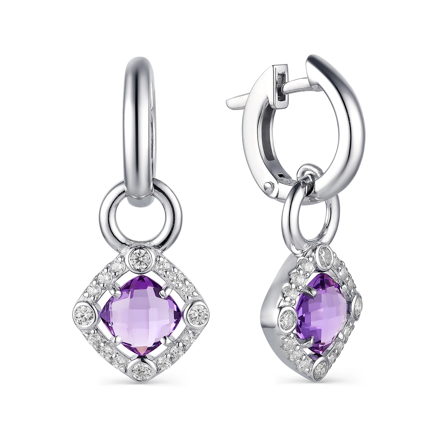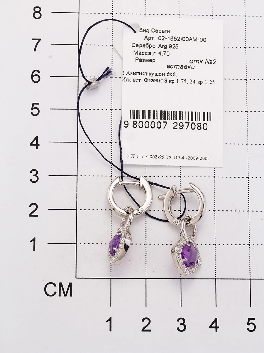Серьги на английском замке из серебра с полудрагоценными вставками (аметист). Высота изделия: 28,3 мм. Ширина изделия: 11,8 мм