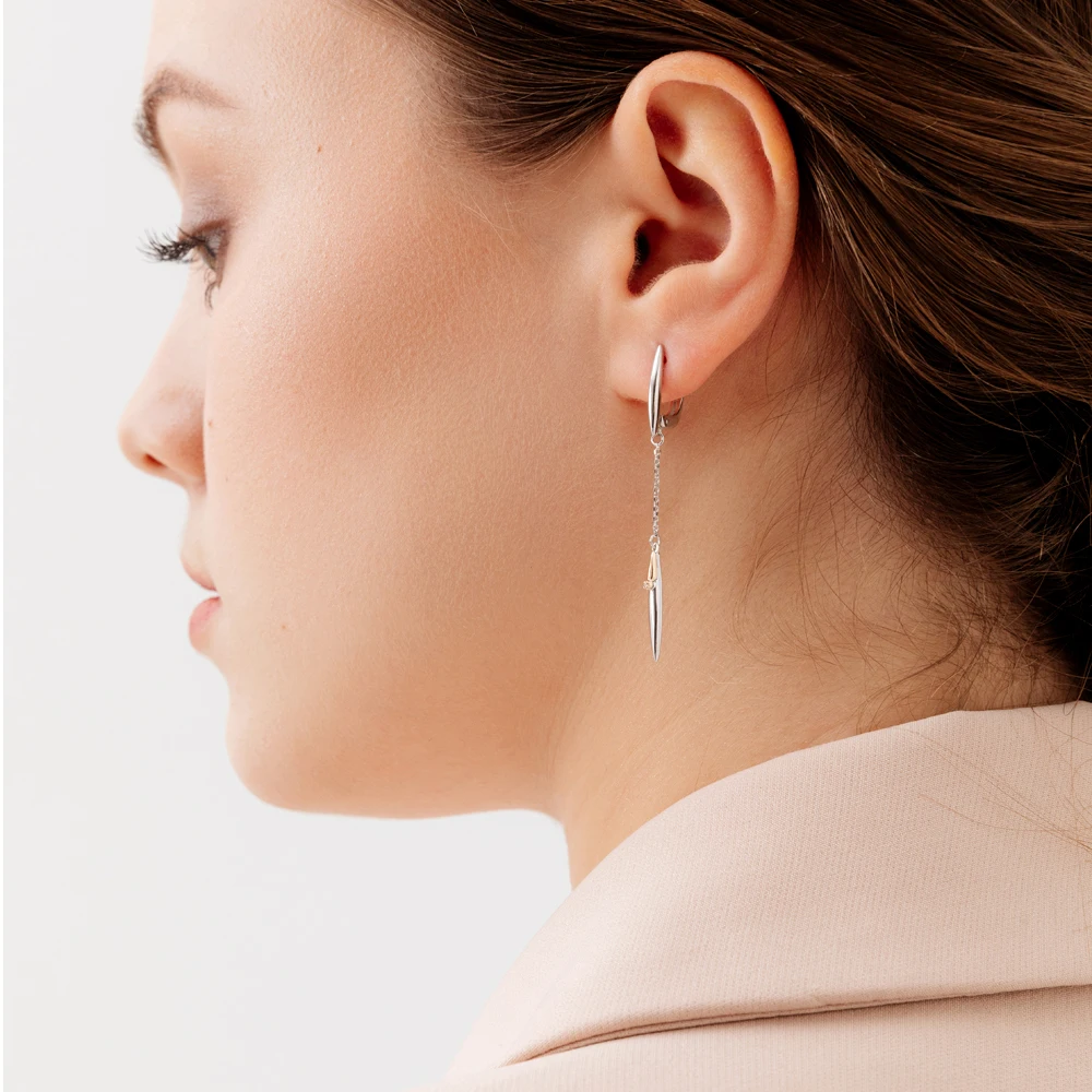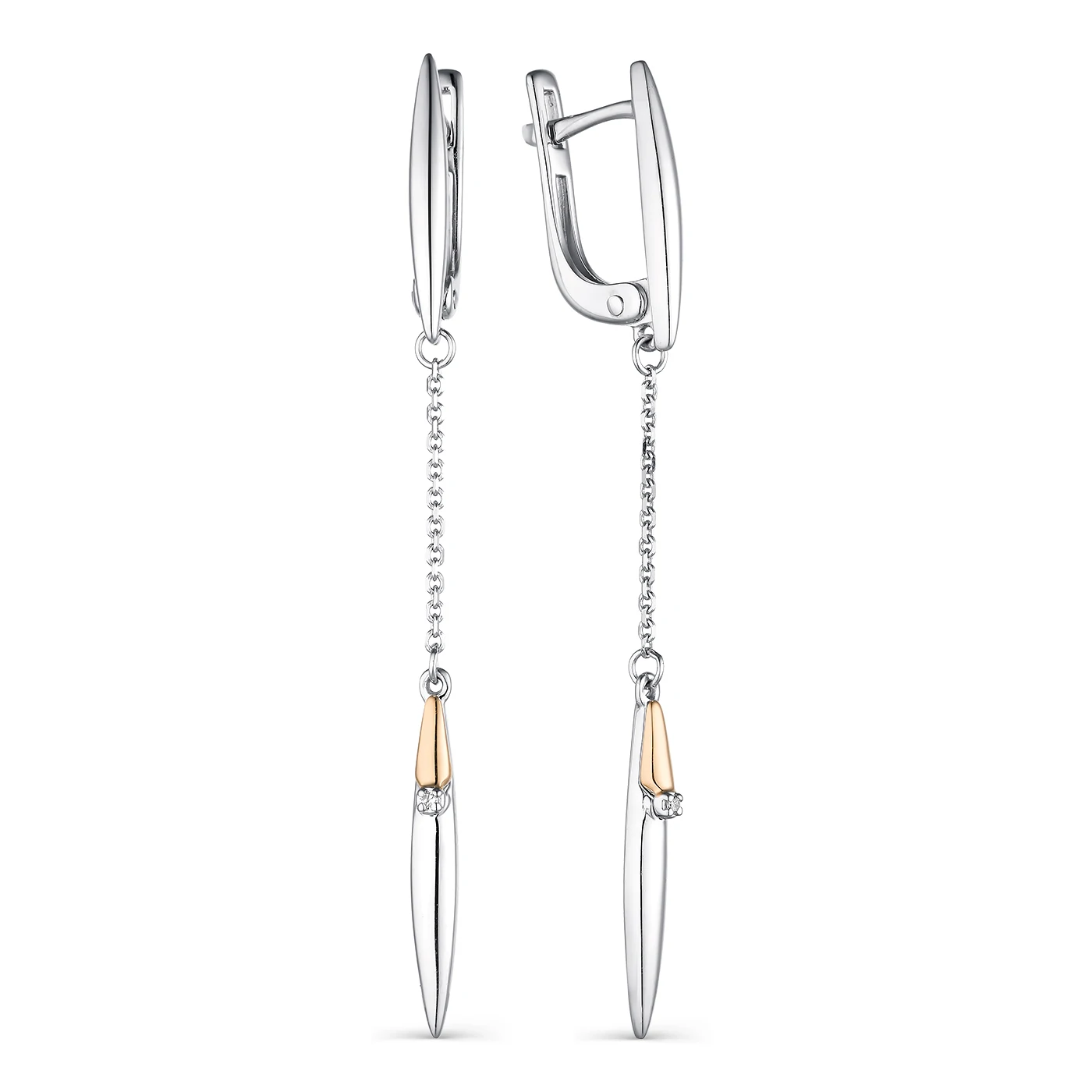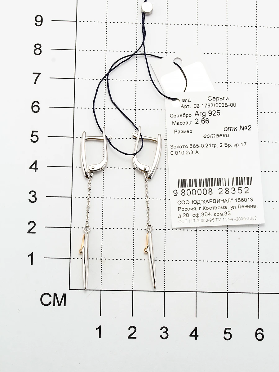 Длинные серьги с золотыми накладками и бриллиантами — это новый уникальный вид украшений. в этом изделии серебро - основа, а золото - декоративный элемент в виде золотой пластины 585 пробы. Вставка: 2 Бриллианта Круг 17 200-400 2/3А, карат. вес: 0,01. Высота изделия: 54,5 мм. Ширина изделия: 2,6 мм. Длинные серьги с золотыми накладками и бриллиантами — это новый уникальный вид украшений. в этом изделии серебро - основа, а золото - декоративный элемент в виде золотой пластины 585 пробы.
