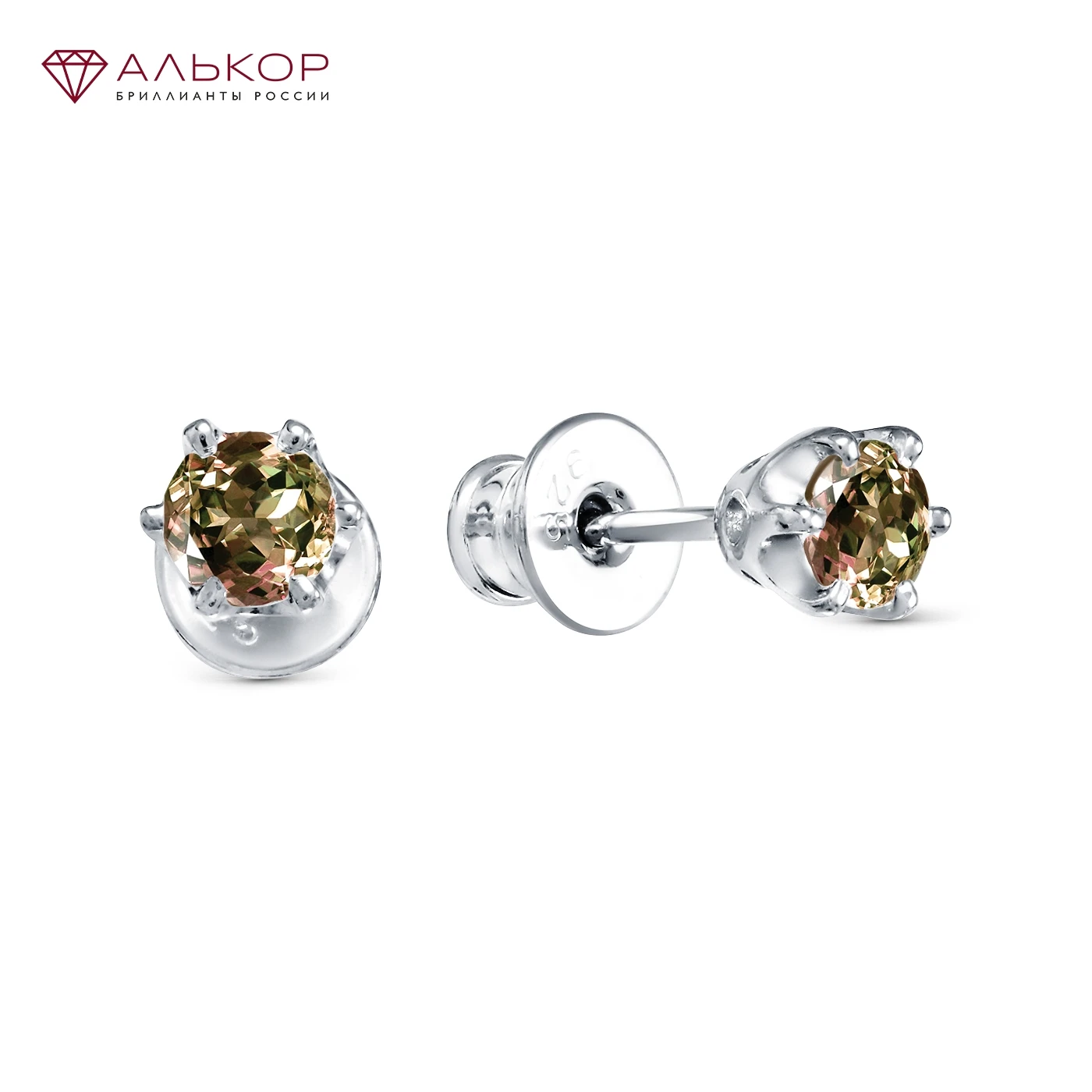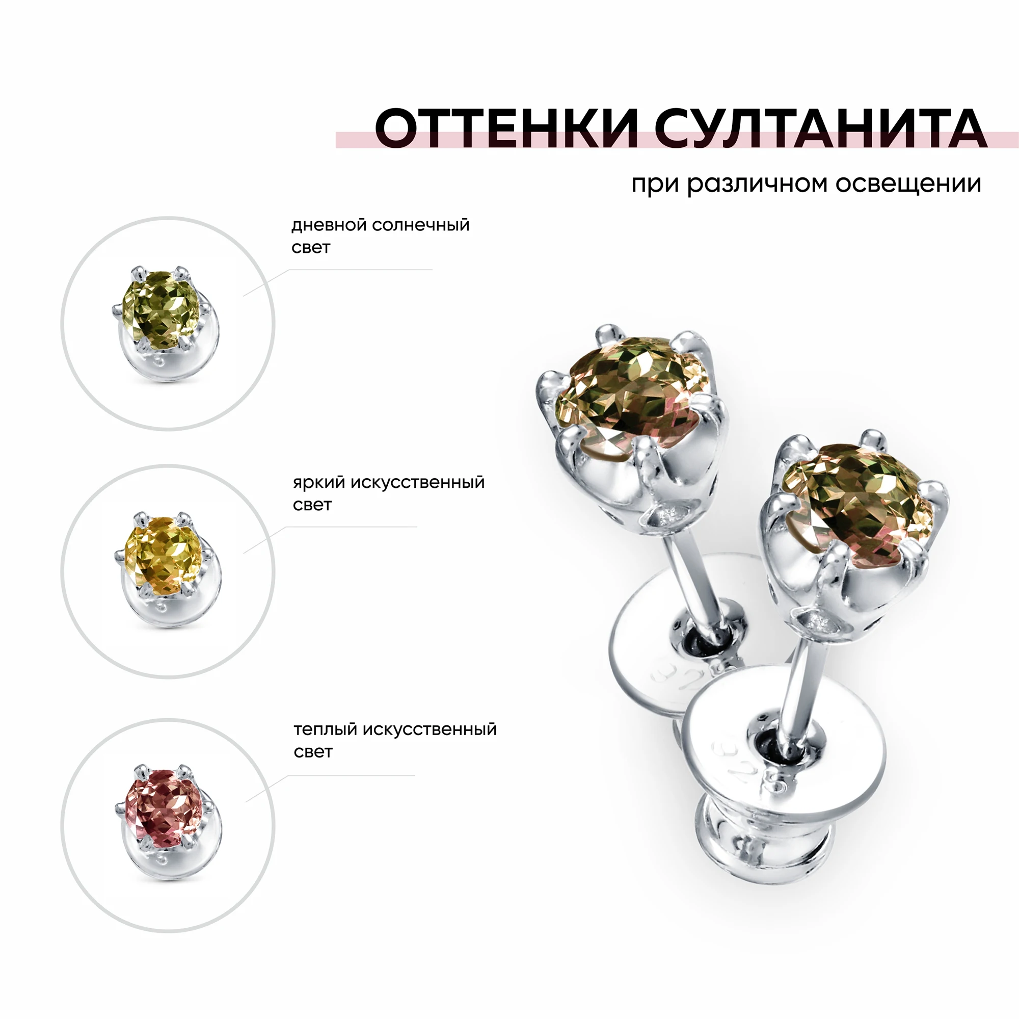 Серьги-пусеты из серебра. Вставка: султанит искусственный. Высота изделия: 5,2 мм. Ширина изделия: 5,2 мм. Аккуратные пусеты из серебра с султанитами, меняющими свой цвет от травянисто-зелёного при слабом освещении до золотисто-янтарного на ярком солнечном свете.