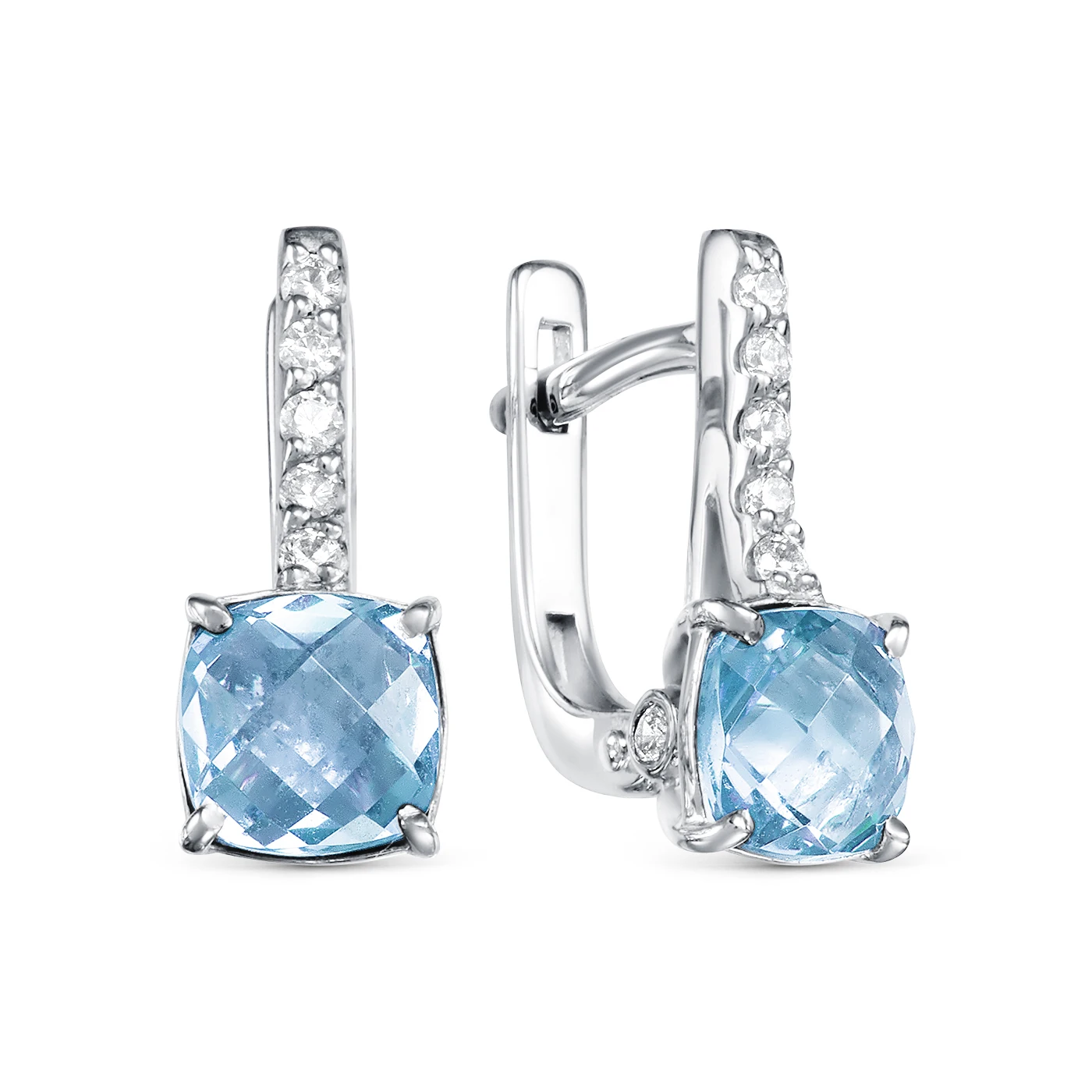 Серьги на английском замке из серебра с полудрагоценными вставками (топаз sky blue) и с фианитовой обсыпкой. Высота изделия: 16 мм. Ширина изделия: 6,2 мм