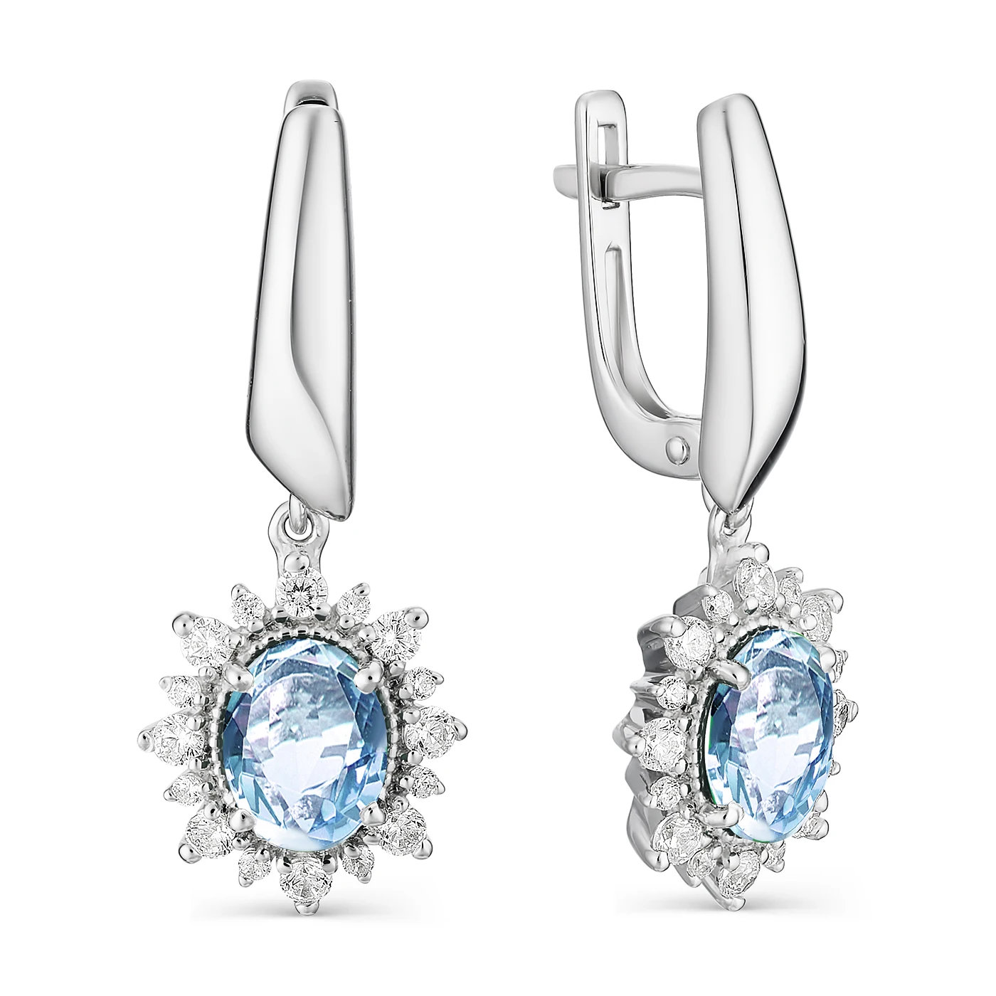 Серьги на английском замке из серебра с полудрагоценными вставками (топаз sky blue) и с фианитовой обсыпкой. Высота изделия: 31,1 мм. Ширина изделия: 12,4 мм