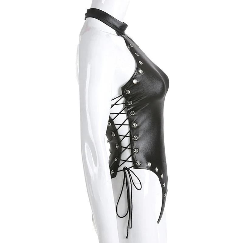 Женское кожаное боди с заклепками, Облегающий комбинезон без рукаво...