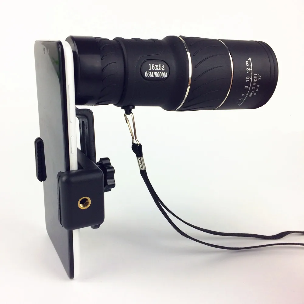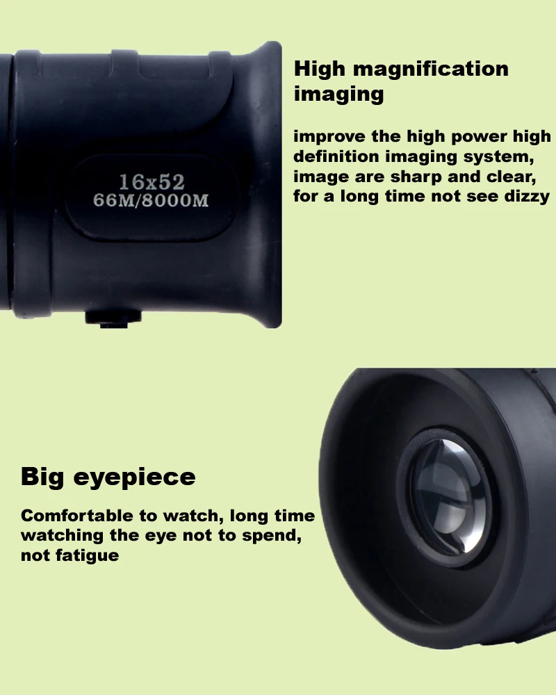 -Этот Монокуляр обеспечивает увеличение 16x и диаметр объектива 52 мм.
