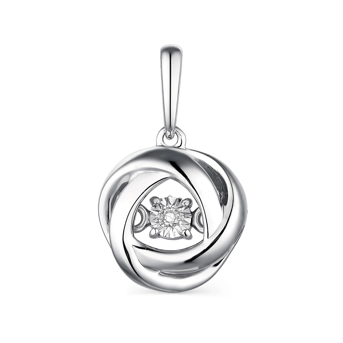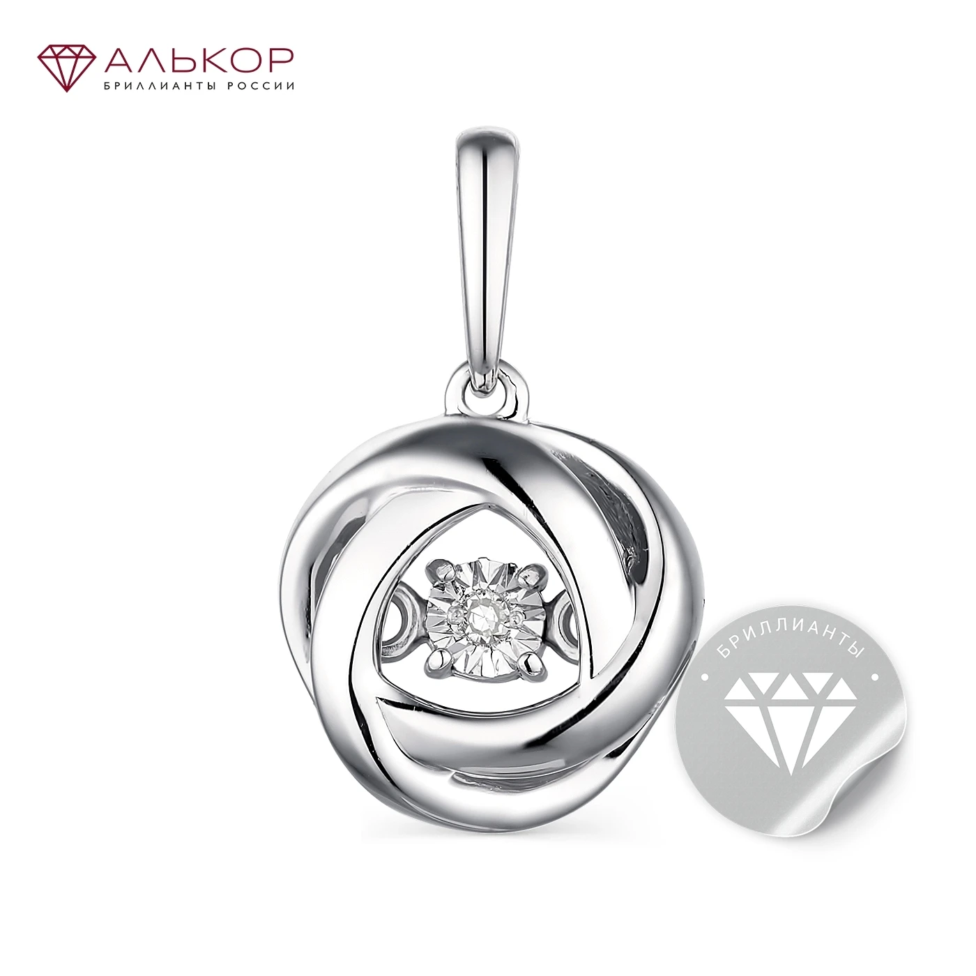 Подвеска из серебра с бриллиантами. Вставка: 1 Бриллиант Круг 17 120-200 2/3А, карат. вес: 0,008. Высота изделия: 18,4 мм. Ширина изделия: 11 мм. Благодаря специальному креплению, бриллиант подвески свободно покачивается в украшении, «танцует». Это усиливает игру света и блеск драгоценной вставки.