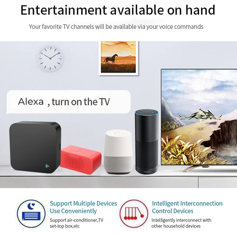 [Голосовое управление]-работает с Alexa Echo для управления домашними устройствами просто голосовой командой, говоря «Alexa, включите кондиционер», «Alexa, уменьшите громкость телевизора».(Google Home поддерживает Голосовое управление только для включения/выключения устройств телеприставки, телевизора, телевизора, вентилятора, Кондиционер и регулировка температуры.)