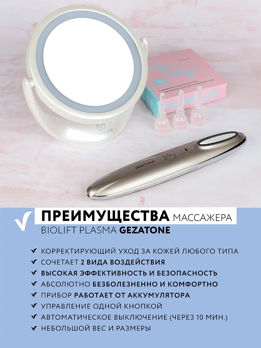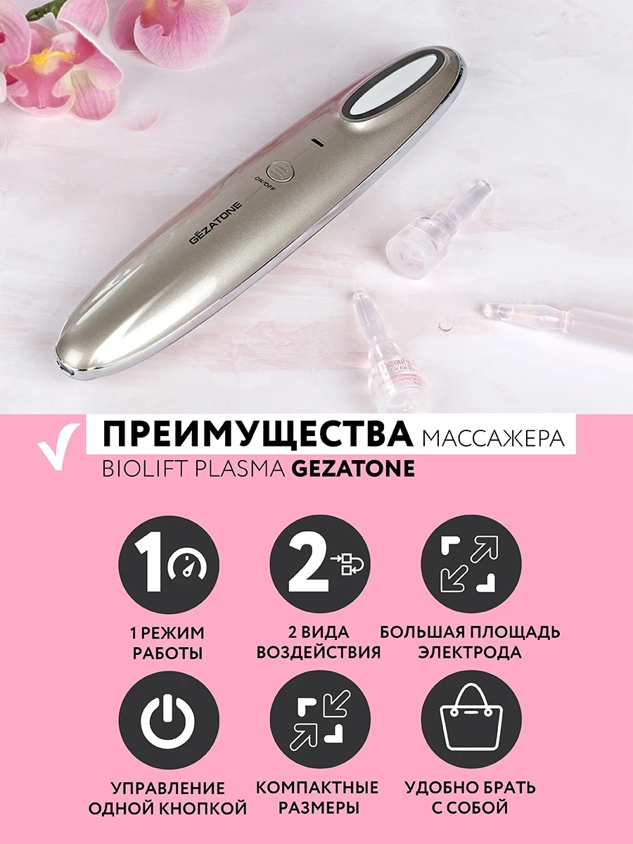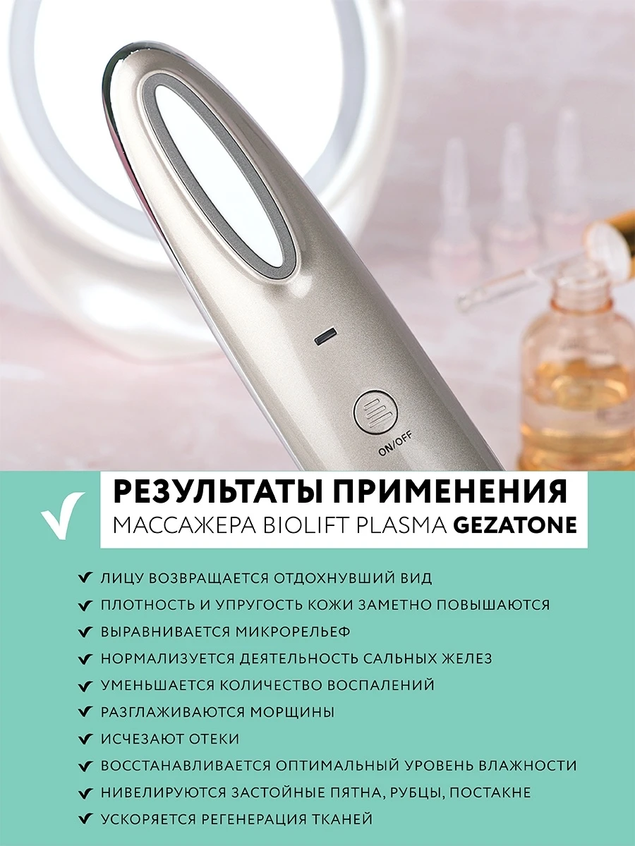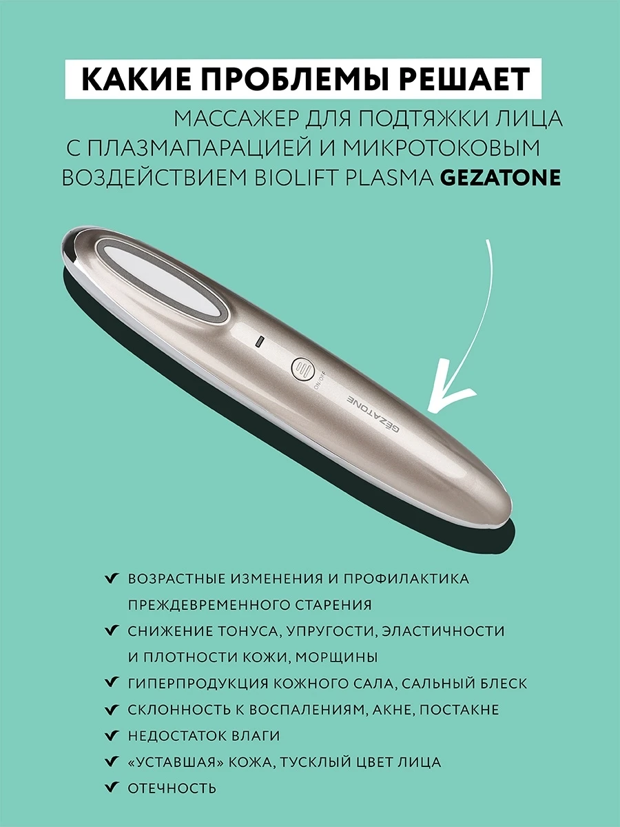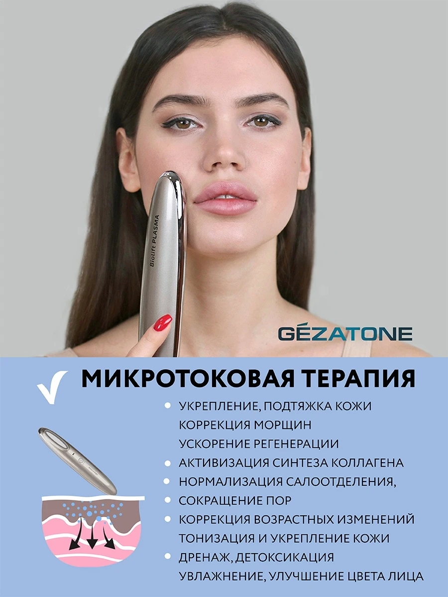 Преимущества массажера для подтяжки лица с плазмапарацией и микротоковым воздействием Biolift Plasma от бренда Жезатон:Прибор Biolift Plasma от производителя Gezatone подходит обладателям любого типа кожи.