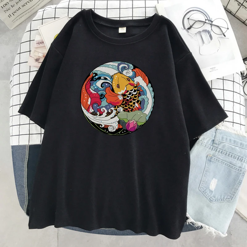 Женская футболка с забавным мультяшным принтом карпа, свободная футболка с креативным рисунком, летняя мягкая уличная одежда, повседневные женские футболки оверсайз, топы