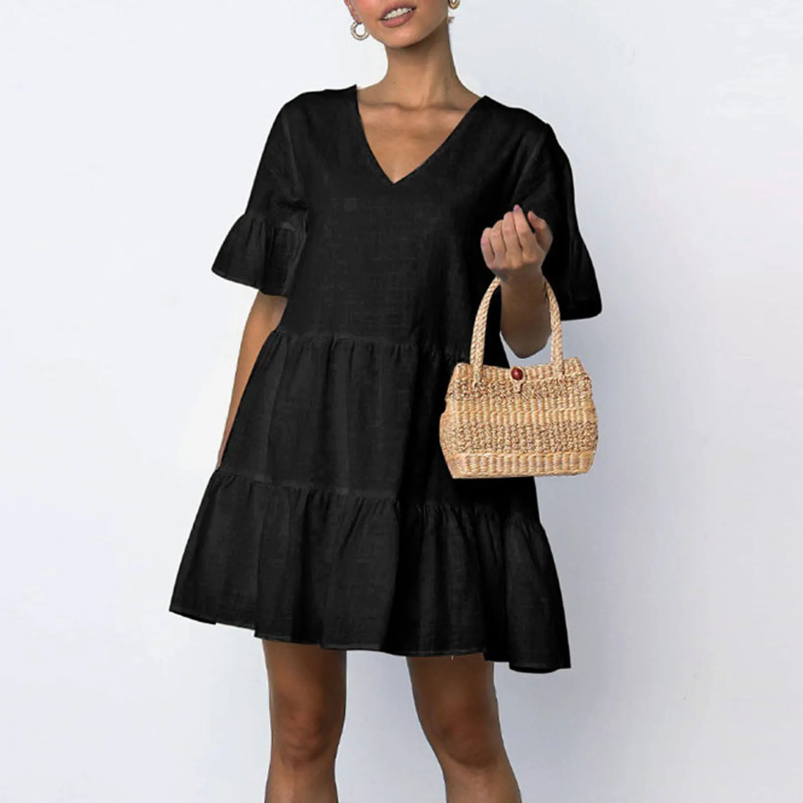 Женское модное повседневное однотонное свободное платье с коротким рукавом и V-образным вырезом Пожалуйста, сверьтесь с таблицей размеров перед заказом. Если вы не уверены в размере, отправьте нам сообщение.