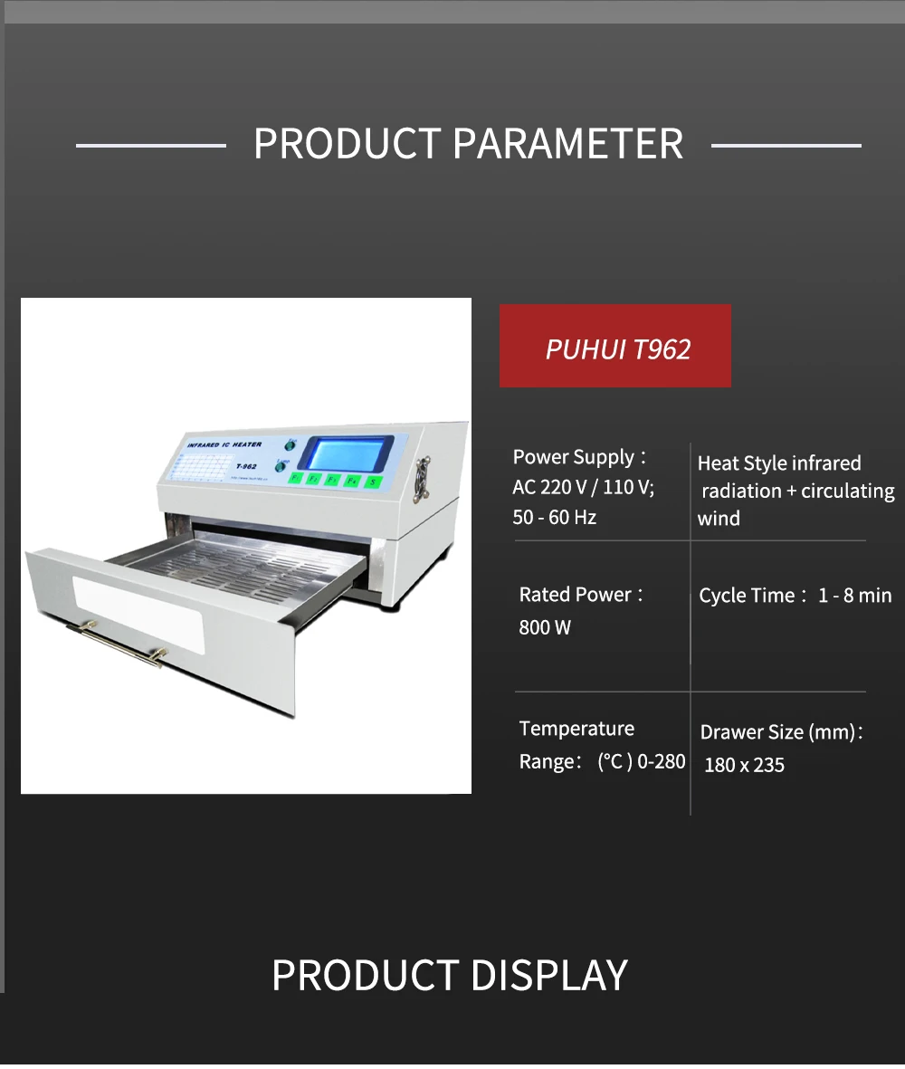 Сертификация CE, простота в эксплуатацииАвтоматически с помощью микрокомпьютерного управленияПолная визуальная работа с ЖК-экраном высокого качестваМожет удовлетворить диссходство SMD. Пайка по запросуБыстрое инфракрасное излучение и циркуляция ветра для тепла, поэтому температура очень точная и дажеВысокий и надежный дизайнЕсть большая Инфракрасная паяльная Максимальная площадь для эффективного достижения 180 × 235 ммСпециальный нагрев и температура equalizationwith all designМного температурных волн выбор для пользователейHumanized science and technology изысканный АртикулИдеальные функции полярности: возврат пайки, сушка, сохранение тепла, завершение разработки, быстрое охлаждениеEqiuped с выхлопным вентилятором, чтобы удовлетворить потребности пайки1) T962-автономный микропроцессор, УПРАВЛЯЕМЫЙ IC нагревателем и наладочная станция для пайки.2). Использует до 800 Вт энергоэффективного инфракрасного нагрева и циркуляции воздуха для оплавления припоя в большой области 180 мм * 235 мм.3) предварительно определяются параметры восьми (8) циклов пайки.4) один оконный ящик удерживает сборки в нагревательной камере.5) циклы пайки выбираются с помощью клавиатуры и отображаются на T962. ЖК-дисплей6) Конструкция T962 является ergononic ,prctical и легко управляется.7) весь процесс пайки автоматически завершается от предварительного нагрева, замачивания и оплавления через охлаждение.8) T962 является ecnomical решением переработы от одиночных пробежек до по требованию малого серийного производства.9) Вес и небольшой fooprint светильник позволяют T962 быть легко помещены на скамейке транспортируется или хранится!Технический параметрМаксимальная площадь пайки: 180 × 235 ммРазмер: 31 × 29 × 17 смРазмер упаковки: 36 × 23 × 36 смНоминальная мощность: 800 ВтПериод процесса: 1 ~ 8 минПоставка: ac220в/50 ГцВес нетто: 6,2 кгВес брутто: 7,5 кг