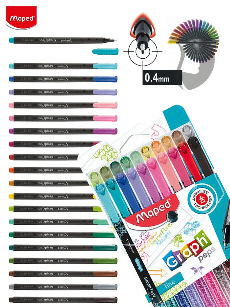 Капиллярная ручка MAPED GRAPH PEP'S, эргономичная зона обхвата, 20 цветов, деко, в футляре