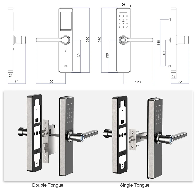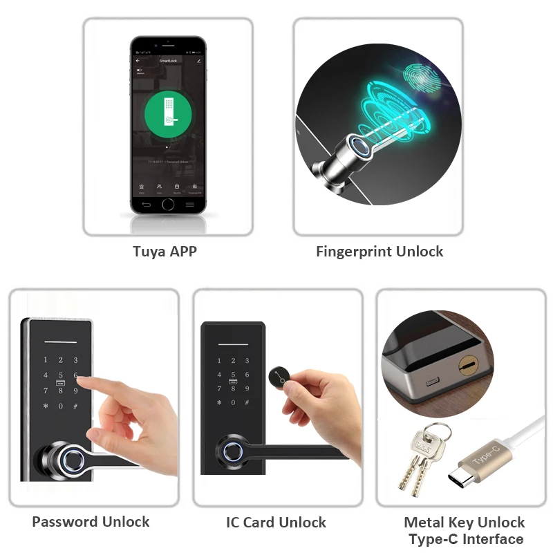 Поддержка приложения Tuya и Smart Life 5 Метод разблокировки Подходит для всех видов дверей разного типа Толщина двери 35-65 мм подходит Подходит как для правых, так и для левых/нажимных и тяговых